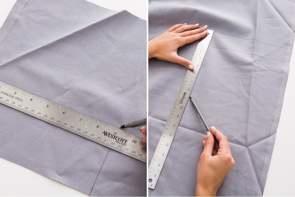 Iron your piece to make sure the edges are as crisp as possible. Then fold into thirds and mark straight lines with pins. You can also measure this portion but we found it easier to just see where the fabric naturally folds. Once you have pinned your two lines, sew a top stitch directly across.