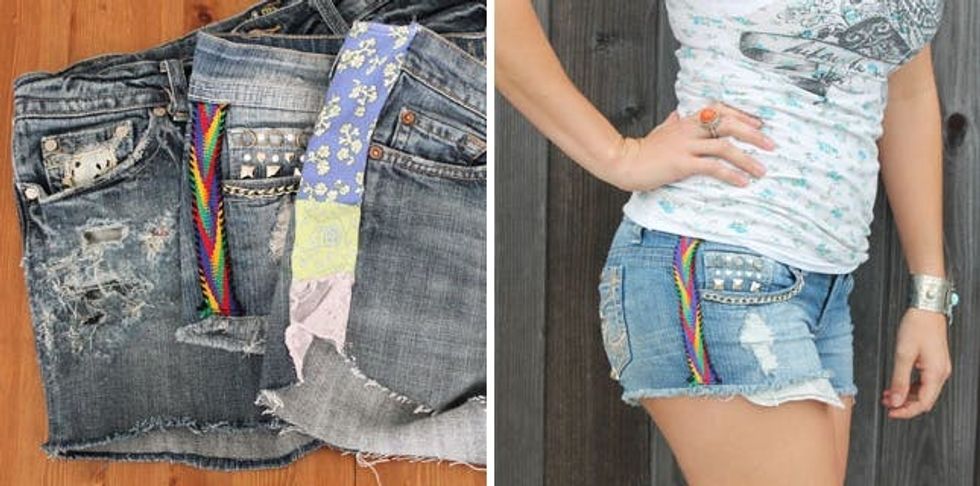 : Once you’ve made the cutoffs, and frayed the edges, these studs will take maximum 20 minutes to add. Did you know embellishing could be so easy? (via