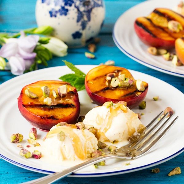 Did your mum ever feed you canned peaches and ice cream when you were little? If that was your favorite dessert, then you’re going to love this grown-up, slightly boozy version even more! Today we’re making juicy grilled peaches served with vanilla ice cream, topped with sticky-sweet amaretto syrup and chopped pistachios. This is a summer dessert to beat all others.