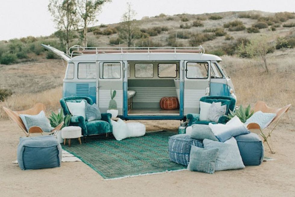 5. Cool Desert Hangout Areas: Incorporate living room-style chill zones — and a VW Microbus if you can fit it. (via Found Vintage Rentals)