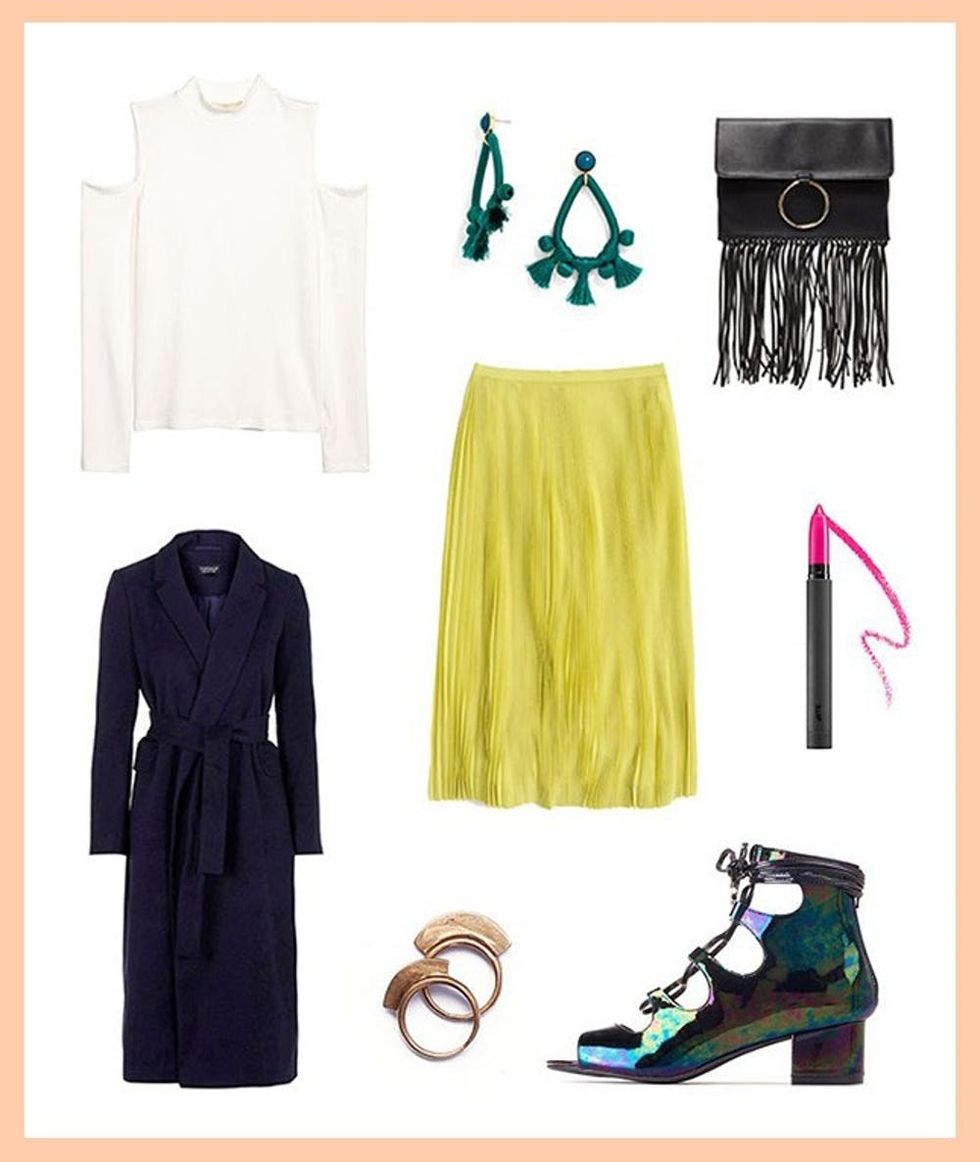 This outfit is proof that you don’t have to bare it all to look fierce. Runway-ready details like a cold-shoulder sweater and iridescent lace-up heels are straight-up sartorial gold, transforming a simple skirt into a getup worth a second glance. Opt for texture and drama for the rest of your accessories to keep the look playful: A fringed-out clutch and tassel earrings are so #OOTD worthy, while a not-so-subtle shade of pink lipstick screams GNO. To complete the look, layer up in style with a sophisticated belted coat.