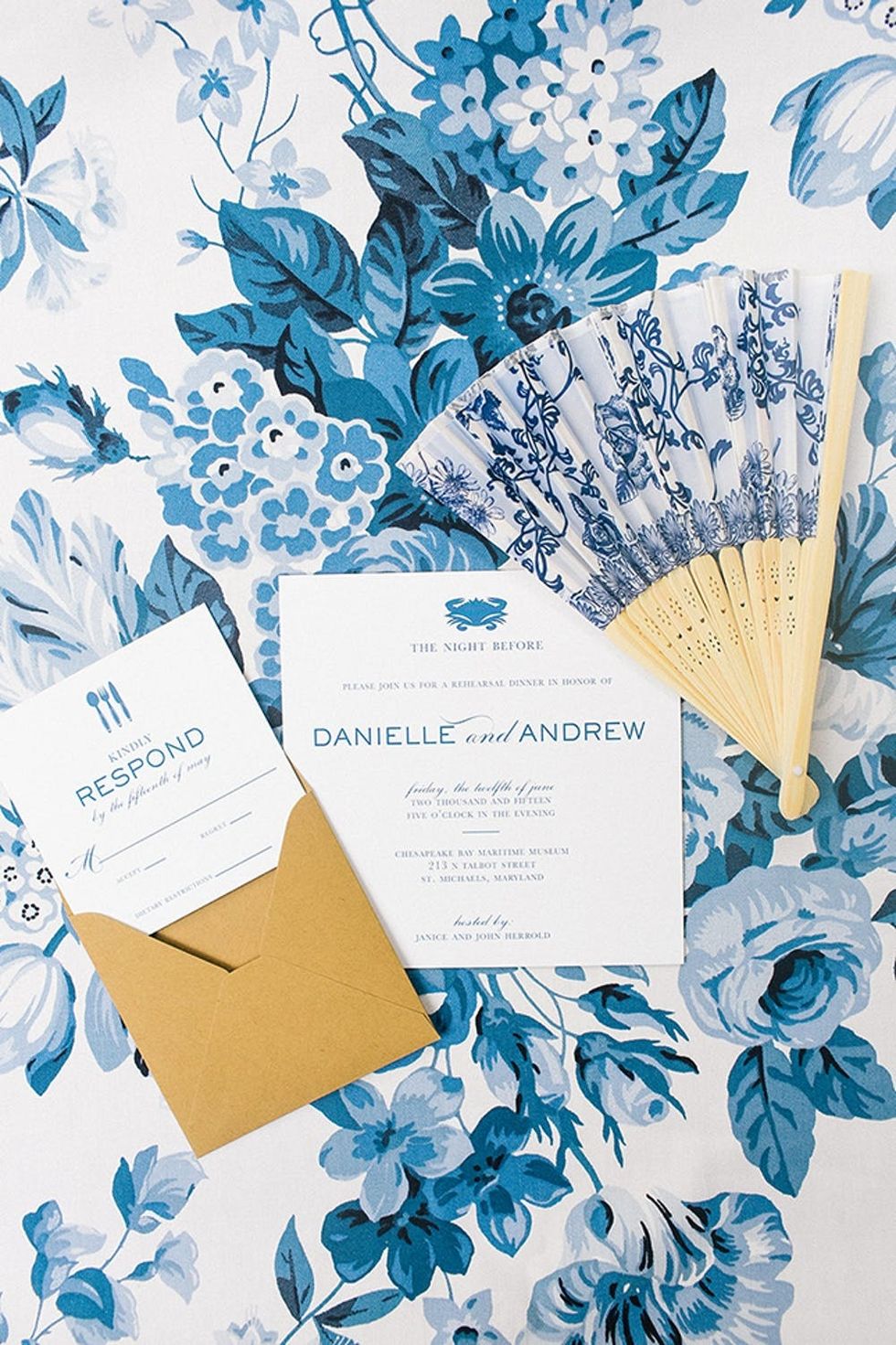 1. Fancy Party Invites: An oh-so-elegant blue-and-white palette, delicate fonts, and an RSVP card will set the tone for your event, even if it starts before the sun has risen. (via Katie Stoops Photography)