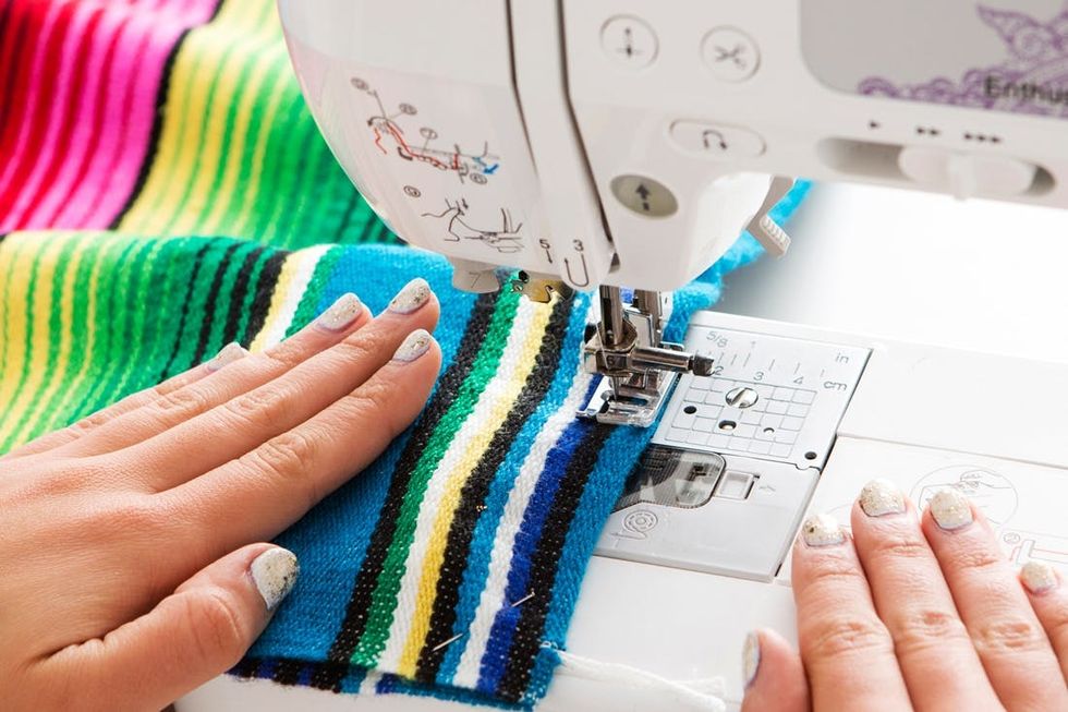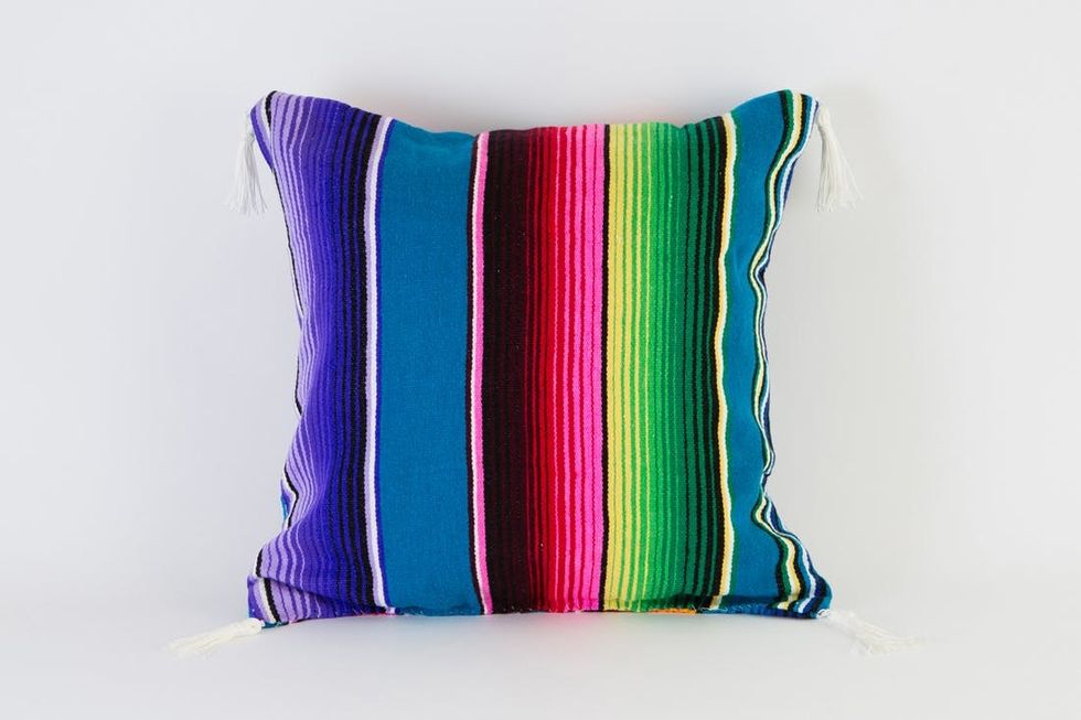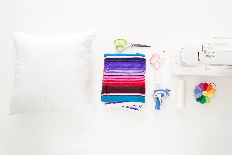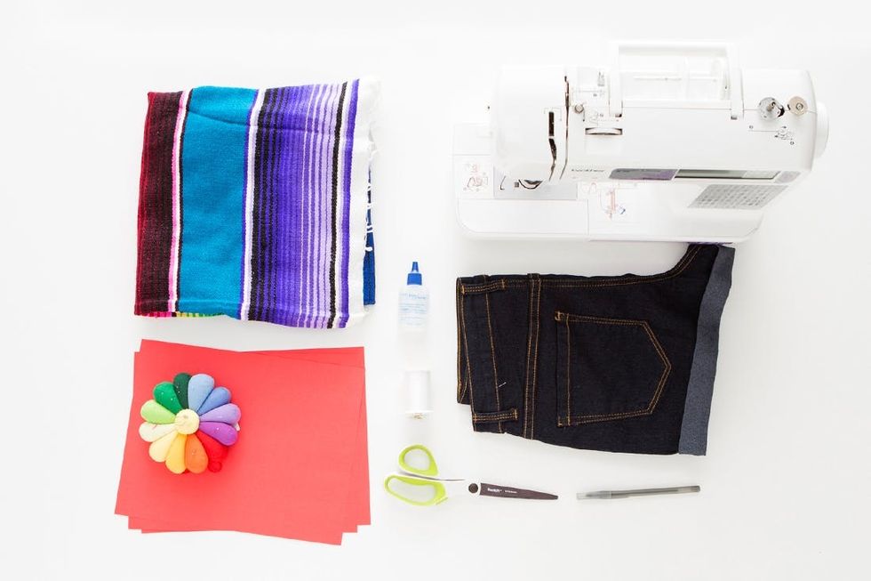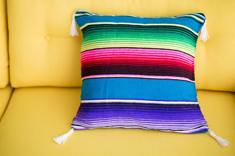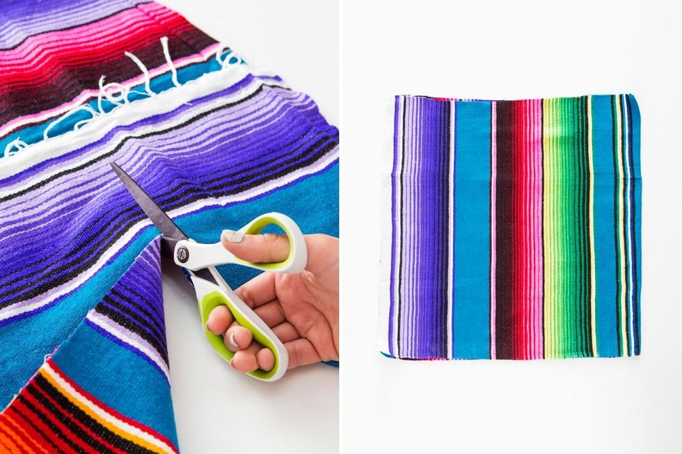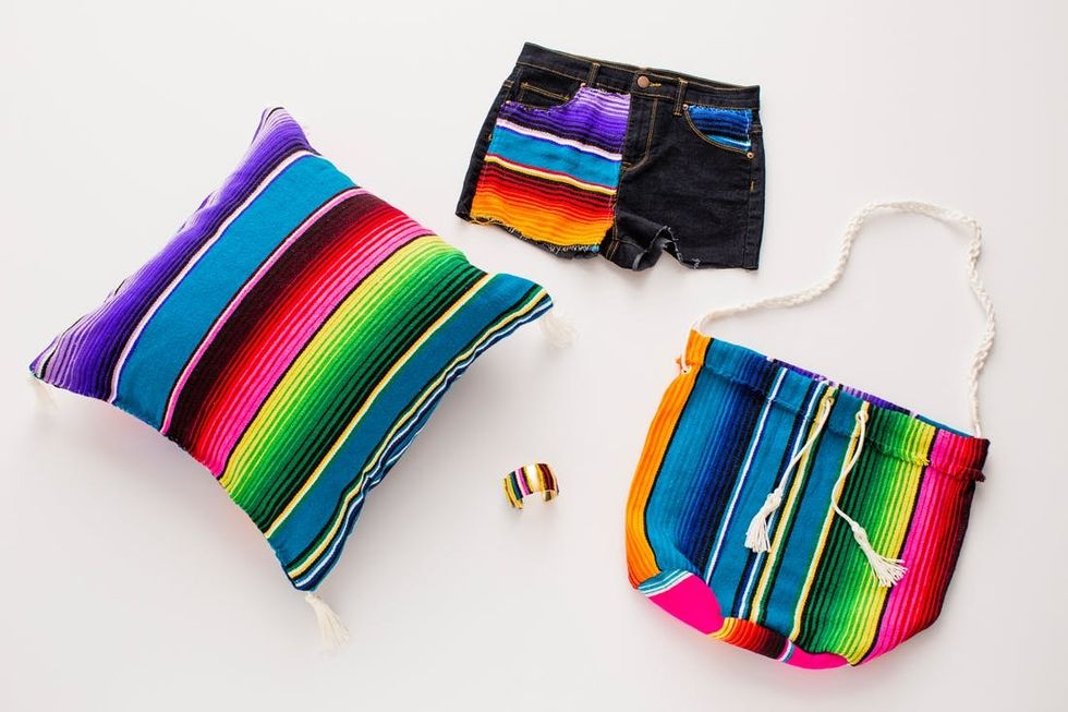 Recently at Brit HQ we made a commitment to get better at reusing and recycling our crafting materials. We often buy materials to create a project but end up with tons of leftovers. These extras fall behind desks, end up in strange office corners, and most often end up in our office dogs’ mouths. So, when brainstorming some summer DIYs, I came up with the idea of repurposing one material into a bunch of new projects! I used one brightly colored Mexican blanket to make five projects that are perfect for summer.