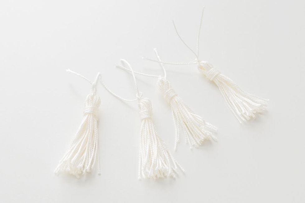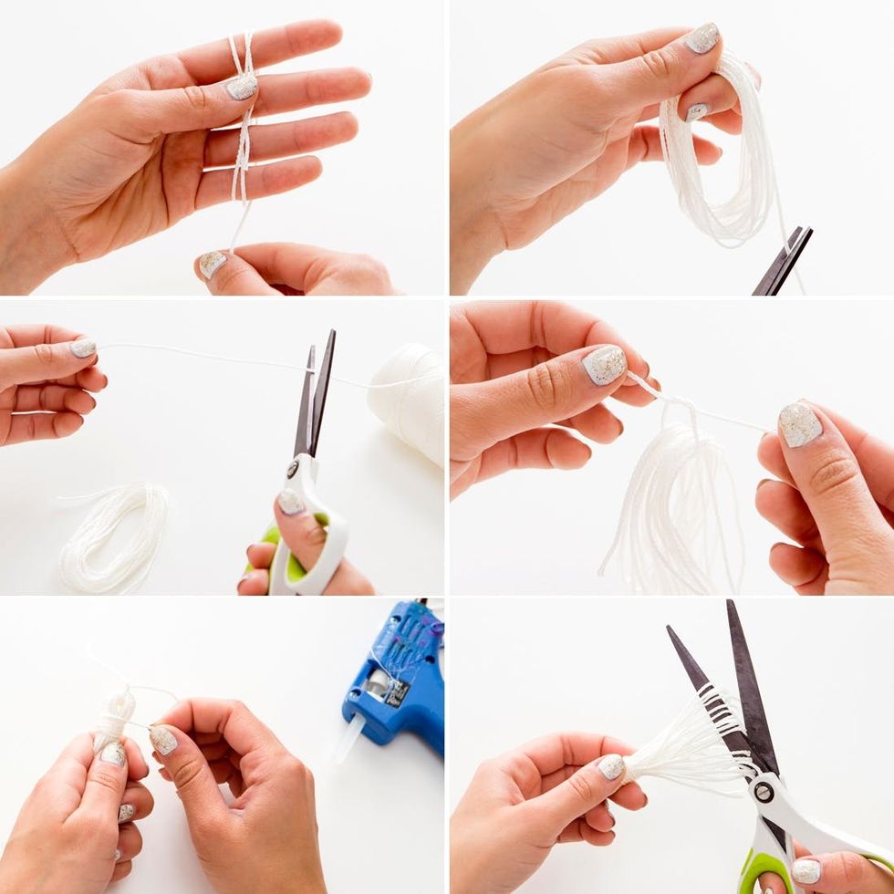 Step one is making the tassel. We used a thin glossy rope, but feel free to use any type of embroidery floss, rope, or cord. Wrap the rope around four fingers at least 20 times. Cut a small piece of rope to loop through the rope and tie it at the top. Cut another piece of rope, secure it to the looped rope with hot glue, and wrap it around the loop tightly so all of the strings stay together. Finally, cut through the loops at the bottom of the tassel and trim to your desired length.