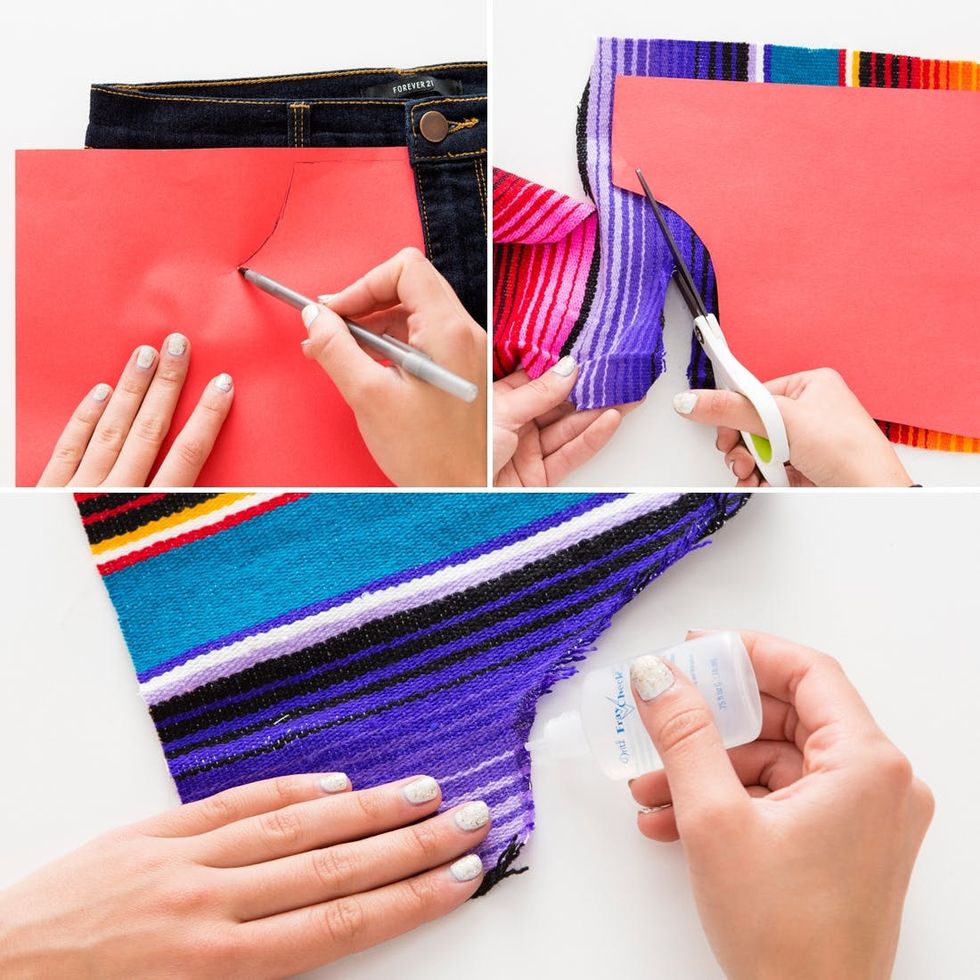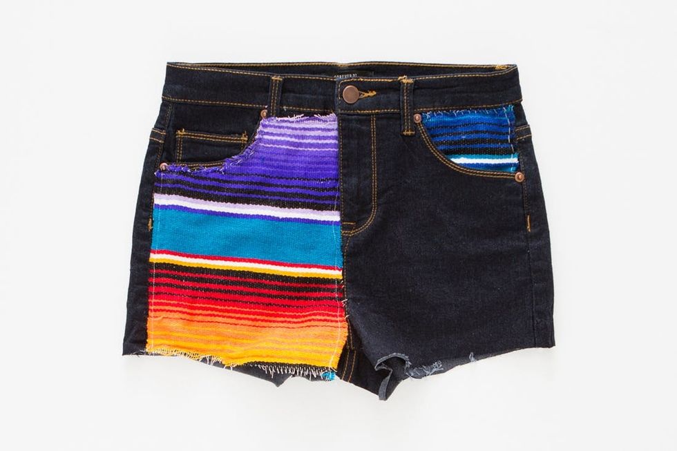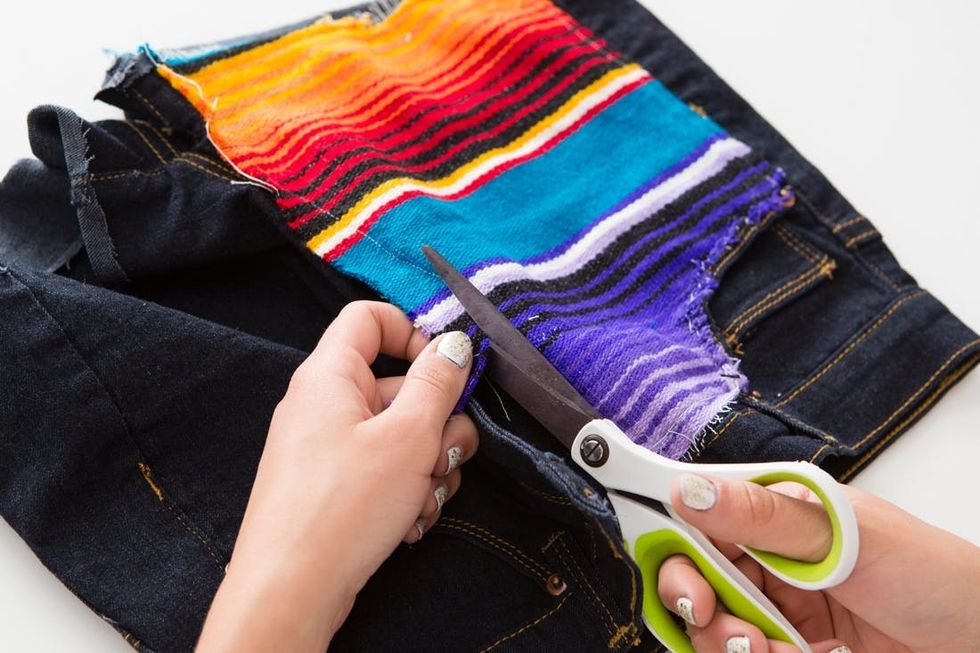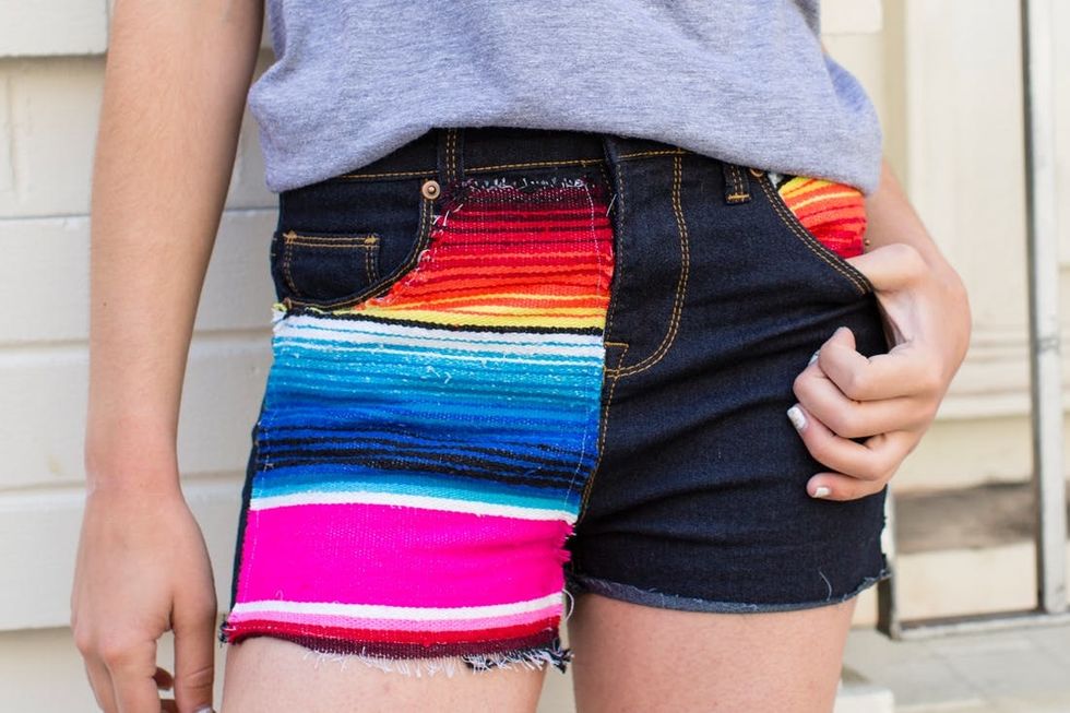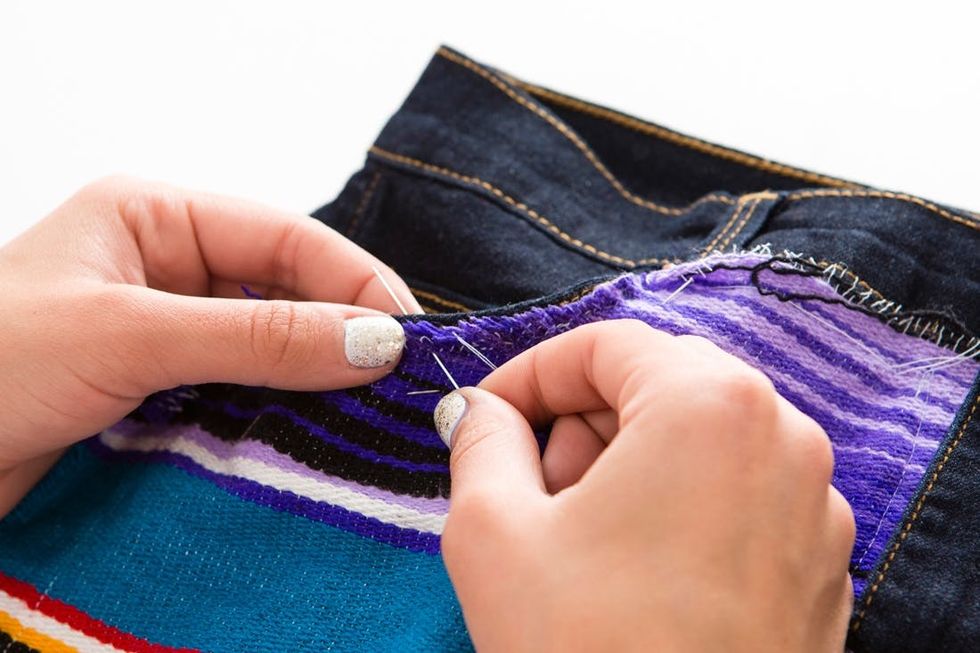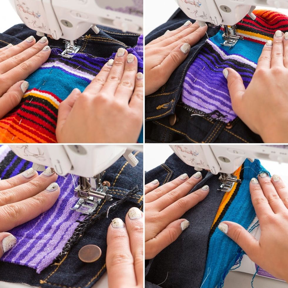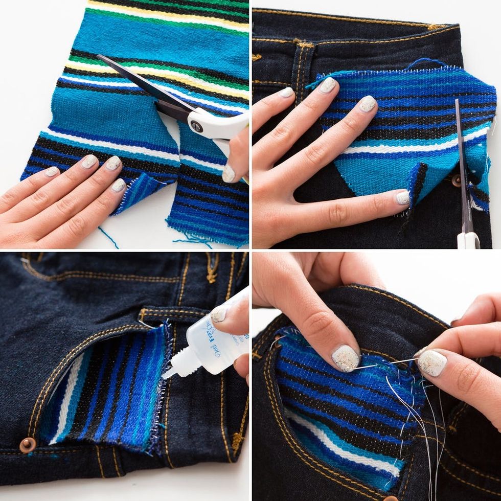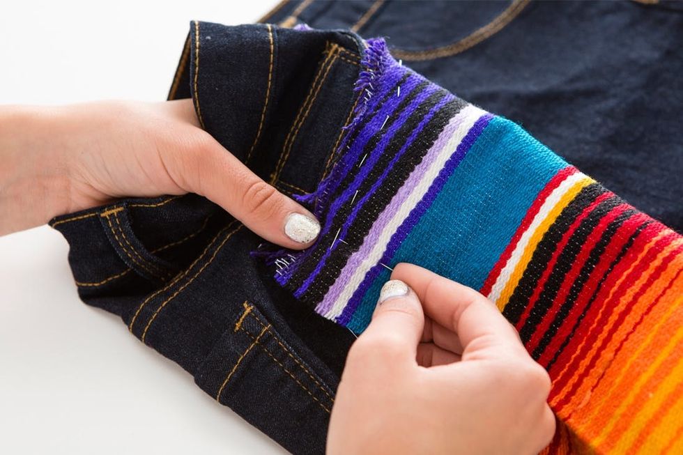 Let’s balance out these shorts with a little colorful blanket on the other side. First, cut out the shape of a pocket, then place and trim to perfection. Use Fray Check for the ends and hand stitch into place.
