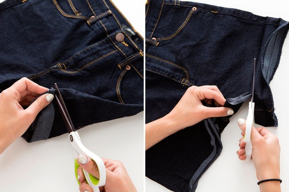 1. Our shorts were rolled up, but we didn't want that as part of our design, so we unrolled them and cut them to our desired length.