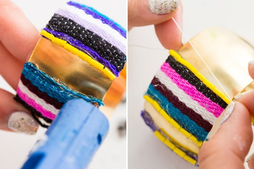 Hide the sides of the fabric with fun beads! Our beads came on a string, which made it super easy to place them in a straight line. Add some hot glue or E-6000 to the bangle and set the beads in place.