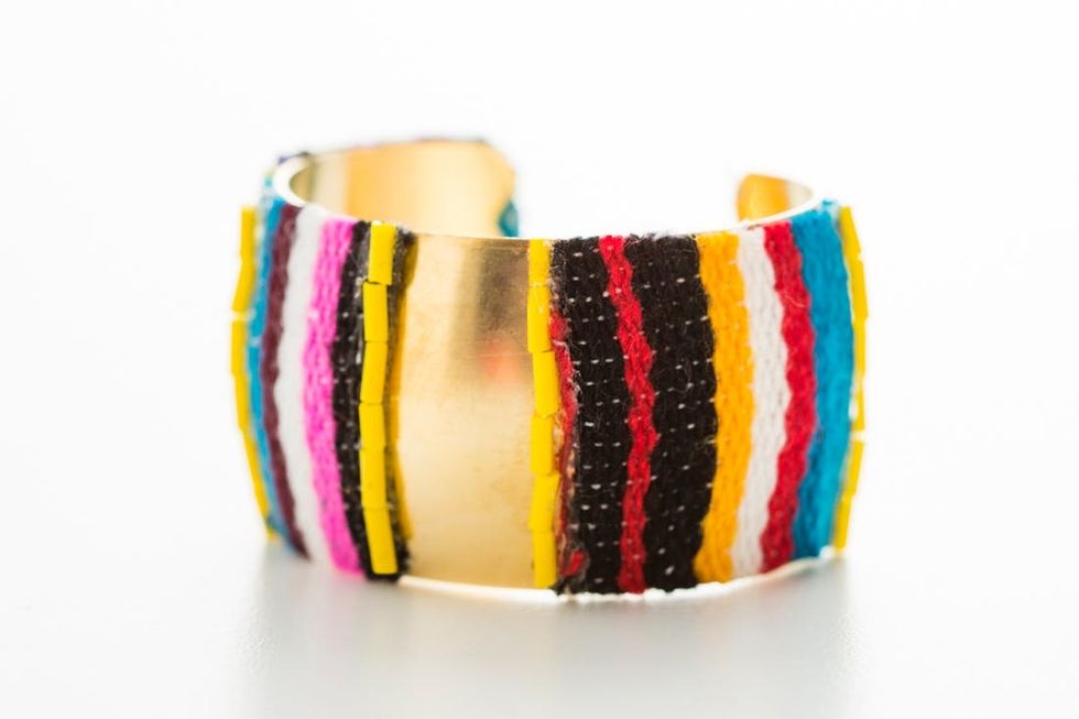 Cut out a colorful square from some leftover scraps. Pile glue onto the bangle and press the fabric in place. Trim the sides to revel the curve of the bangle.