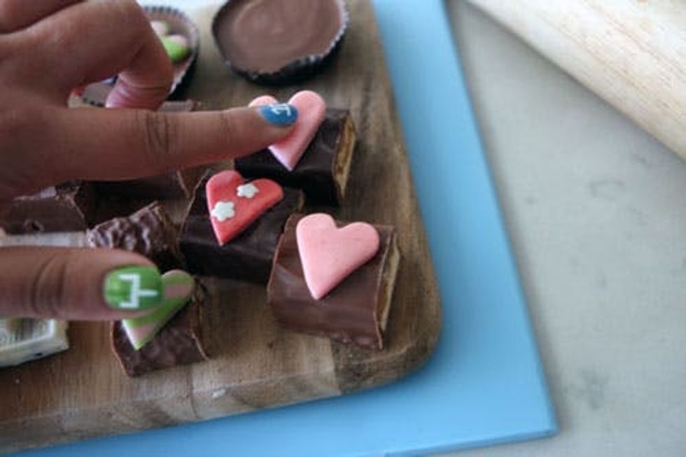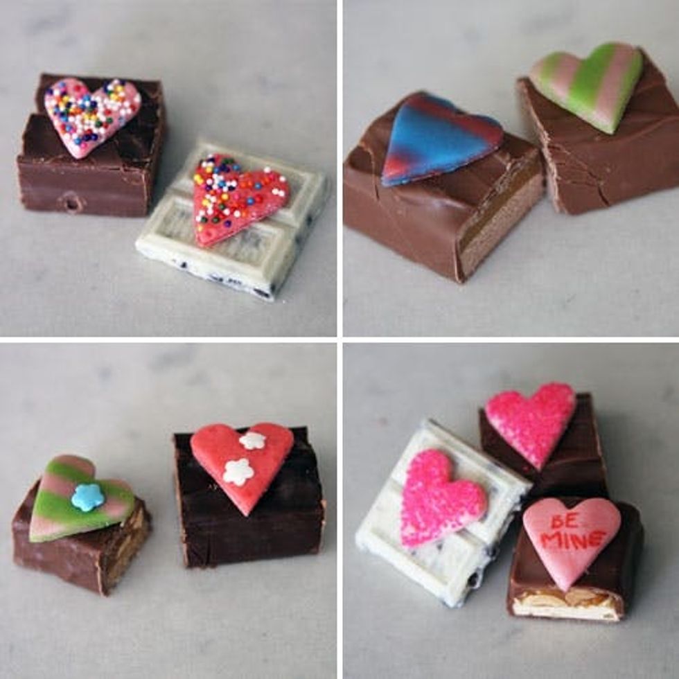You can decorate your hearts using sprinkles or even a gourmet food pen, and then press onto each chocolate. *If you use sprinkles, press them into the Airhead or Starburst before using the cookie cutter.