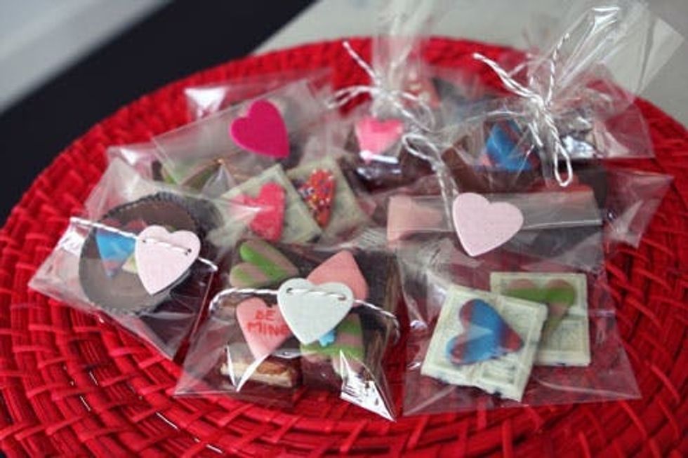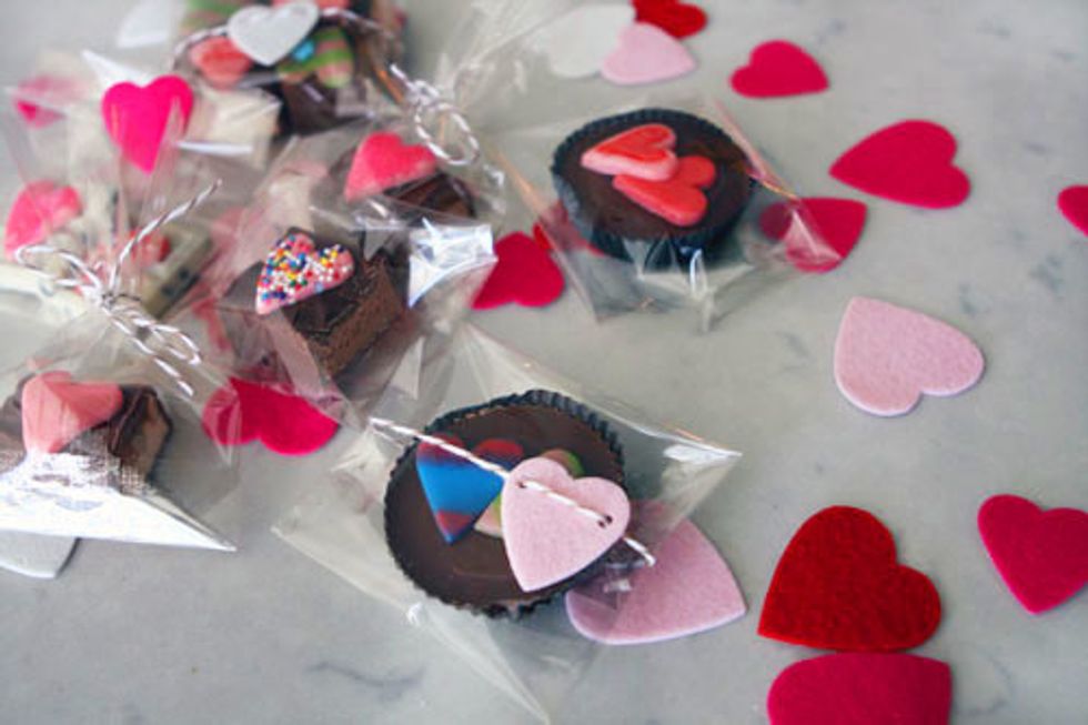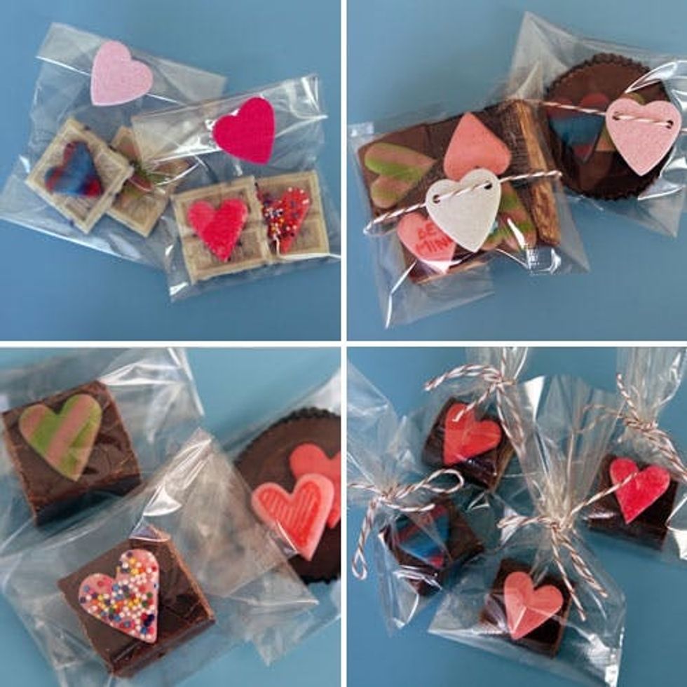 Using clear gift bags and baker's twine, you can simply bundle up chocolates individually, or in bunches. To keep things more linear, you can simply fold the clear plastic over your chocolate and tape on the back. And for some extra flare, attach cut our felt hearts.
