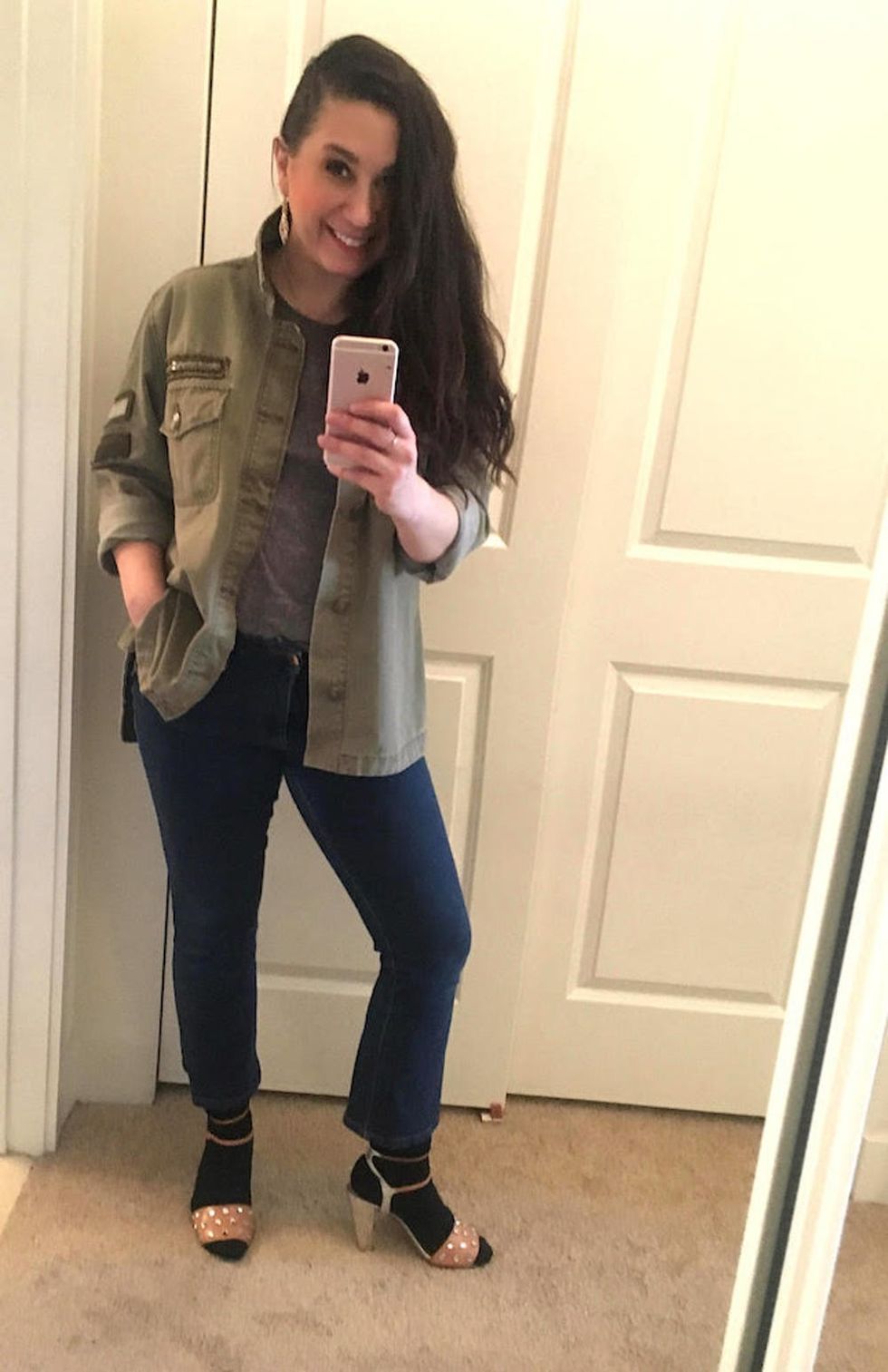 Style stars always seem to be throwing everything in their closet on at once and making it into a look. I have to say, mixing prints was kind of freeing. I paired my Gap army jacket with a J.Crew striped turtleneck and American Eagle polka dot pajama pants (that are totally acceptable to wear out) and I didn’t feel at all like I got dressed in the dark. My prints are always of the somewhat subdued variety, though, so it was fairly easy to make it all work. Plus, camo goes with pretty much everything. I added my favorite red TDE bucket bag for a pop of color. The verdict: I would totally do this again.