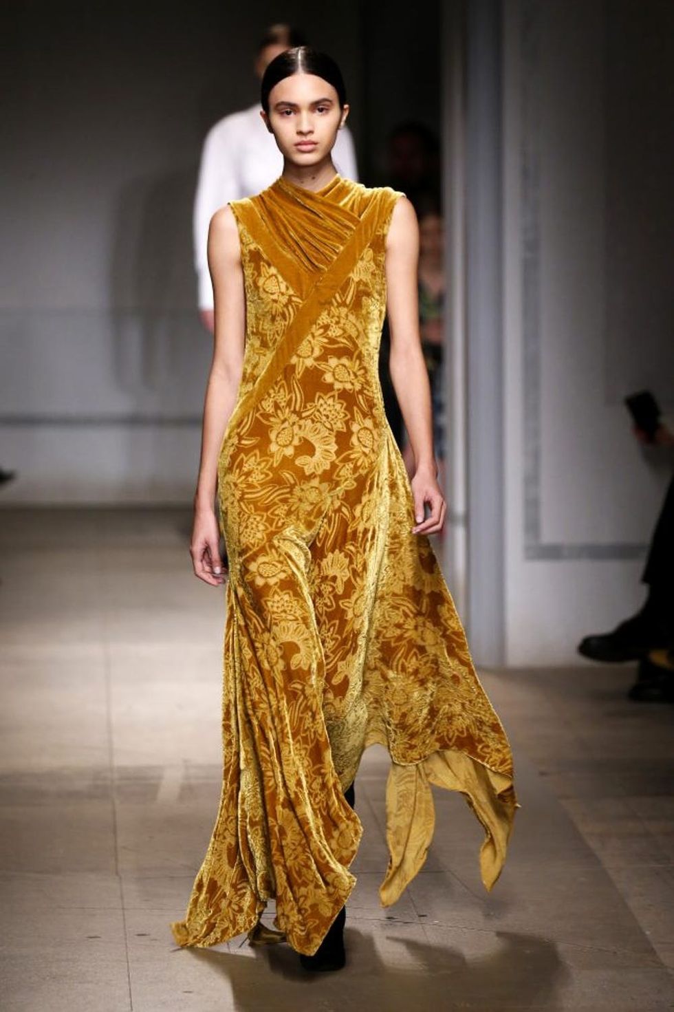 Velvet is back and better than ever. And this time, nothing is off limits. We’re crushing on all the rich jewel-tone hues the sumptuous fabric comes in for fall, like this topaz-colored evening gown by Erdem. (Photo via Estrop/Getty)