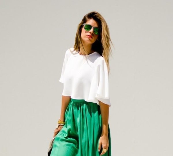 10. The Green Skirt: It’s no secret that a vibrant green skirt is absolutely gorgeous, but it’s even more so when paired with a flowy shirt and flashy sunglasses. (via Ms Treinta)