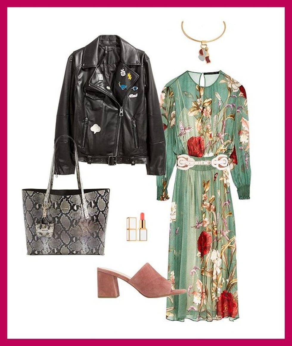 H&M Biker Jacket ($70) + Zara Floral Print Flowing Dress ($100), Seychelles Commute Mule ($110), Madewell Modernism Choker Necklace ($45), Uterqüe Snakeskin-Effect Tote Bag With Interior Bag ($249), BCBG Woven Faux-Leather Waist Belt ($88), Tom Ford Clutch-Size Lip Balm in L’Odissea ($36)