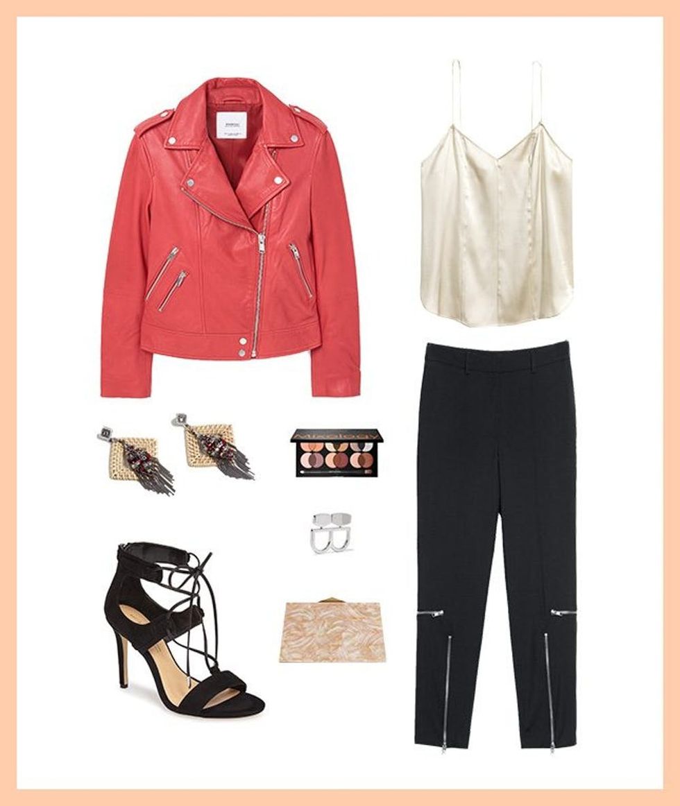 Mango Leather Biker Jacket ($200) + & Other Stories Zipped Trousers ($125), Uterqüe Rattan Earrings ($53), H&M Silk V-neck Camisole Top ($60), Daya by Zendaya Starke Sandal ($100), MM6 Maison Margiela Two-Finger Silver-Tone Ring ($98), Uterqüe Pale Pink Cubist Clutch ($140), Mixology Eyeshadow Palette ($34)