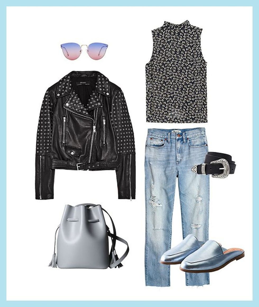Whatever your weekend agenda entails, you can count on this effortless outfit formula to ensure you get through every brunch date and errand in style. Classic denim, low-profile slides, and a roomy bucket bag offer up a healthy dose of versatility, comfort, and functionality to keep up with your girl-on-the-go lifestyle, while details such as a ’90s mock-neck top, mirrored shades, and a grommet-studded leather jacket deliver just the right amount of oomph to keep things feeling fashionably fuss-free.