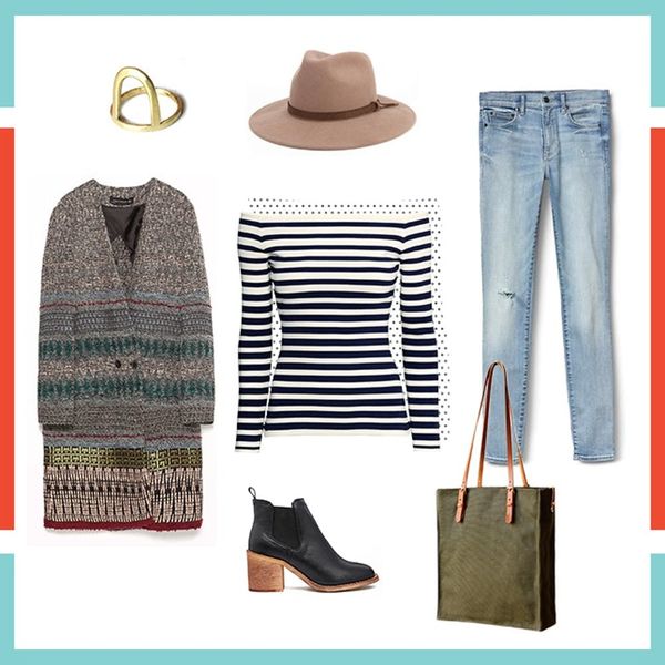 H&M Off-the-Shoulder Top ($35) + GAP 1969 Destructed Resolution True Skinny Jeans ($70), Slantt Sol Ring ($50), Urban Outfitters Alexa Panama Hat ($69), Future Glory Presidio Tote ($175), River Island Gusset Block Heeled Ankle Boots ($71), Zara Jacquard Patterned Double-Breasted Coat ($199)