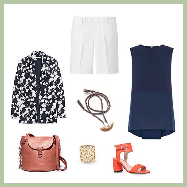 Uniqlo Bermuda Shorts ($30) + Diane Von Furstenburg Printed Silk Blazer ($174), Kurt Geiger Kindly Carvela ($105), Warehouse Button Back Shell ($57), Tiro Tiro Lado Necklace ($215), Madewell Fringe Bucket Bag ($168), Club Monaco Campbell Loopy Cow Ring ($99)