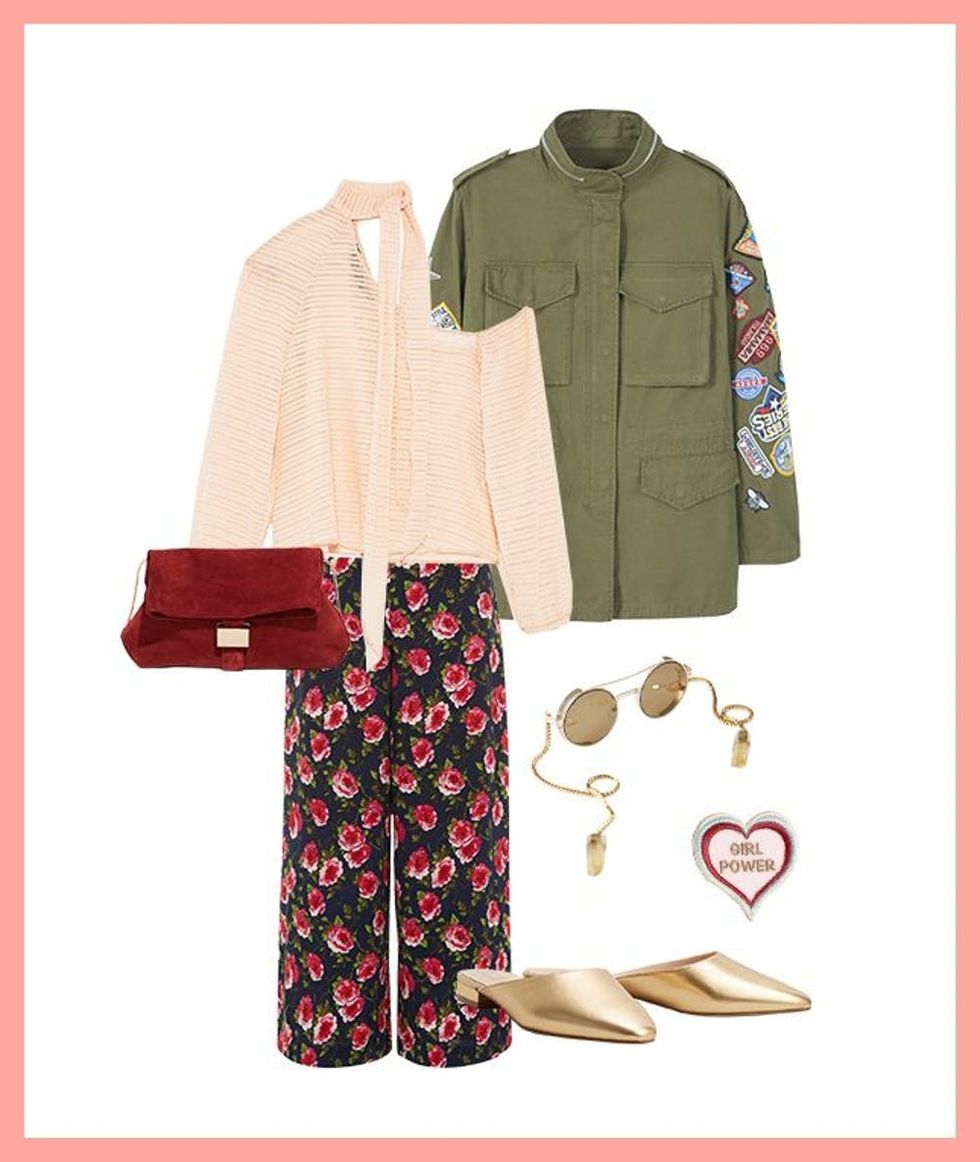 Whether headed off on a romantic weekend with your partner in crime or bonding with Mom over dinner and a show, best believe this flirty #OOTD will see you through. Gilded flats and a patched-up field jacket ensure your elevated essentials, such as a cold-shoulder blouse and floral culottes, keep stay fuss-free from day to night. Round out the look with a swoon-inducing suede bag and statement shades that epitomize street style bait.