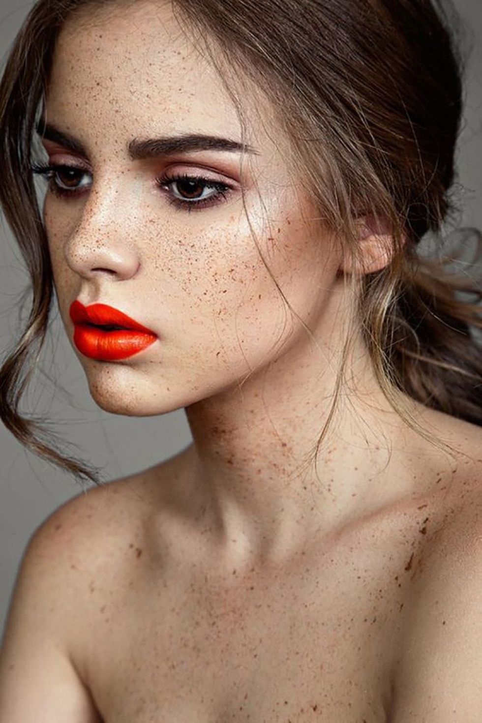 FYI: You can wear punchy pigments on your cheeks if you want to feature your freckles. A healthy, radiant pink wash of color instantly perks up your complexion, and a deep, berry lip is the stunning finishing touch. “I recommend leaving the skin bare for a look that focuses on bright cheeks and lips,” Rebecca explains. “Just add a little concealer where you need it and sheer color to the cheeks with NARS Multiple Tint ($39) in Jeanette to keep up the dewy, fresh appearance of freckled skin.” (Photo via BeautyHigh)