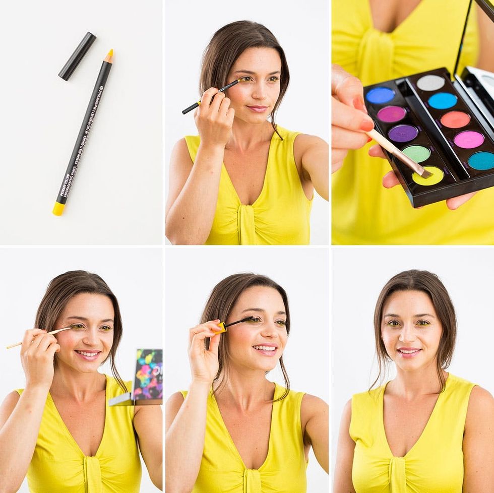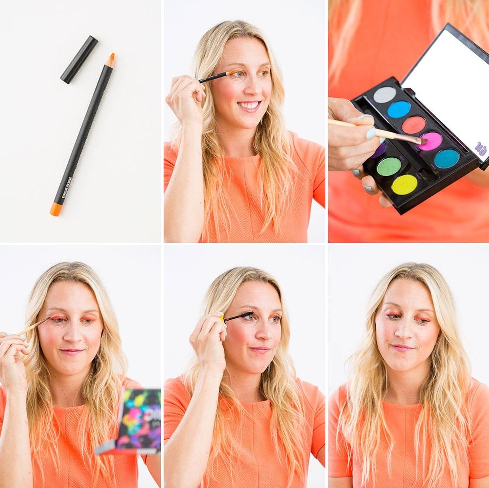 Obviously we are all about neon everything here at Brit + Co, so when neon eyeliner made its mark in the beauty scene this season, we were beyond inspired to jump on board the trend. That’s especially because getting the look is way easy when you’ve got a palette of vibrant colors at hand. While you can build your own neon collection by picking up highly-pigmented pieces at a drugstore here or online there, we cut out the treasure hunt completely by using this amazing Electric Pallet by Urban Decay ($49) from Sephora. A bit of a splurge for such out-there shades, we know. But when you think about all the extra special looks you can create for yourself year round (not to MENTION amping it up for Halloween!), the purchase is totally worth it — scroll on to see what we mean.
