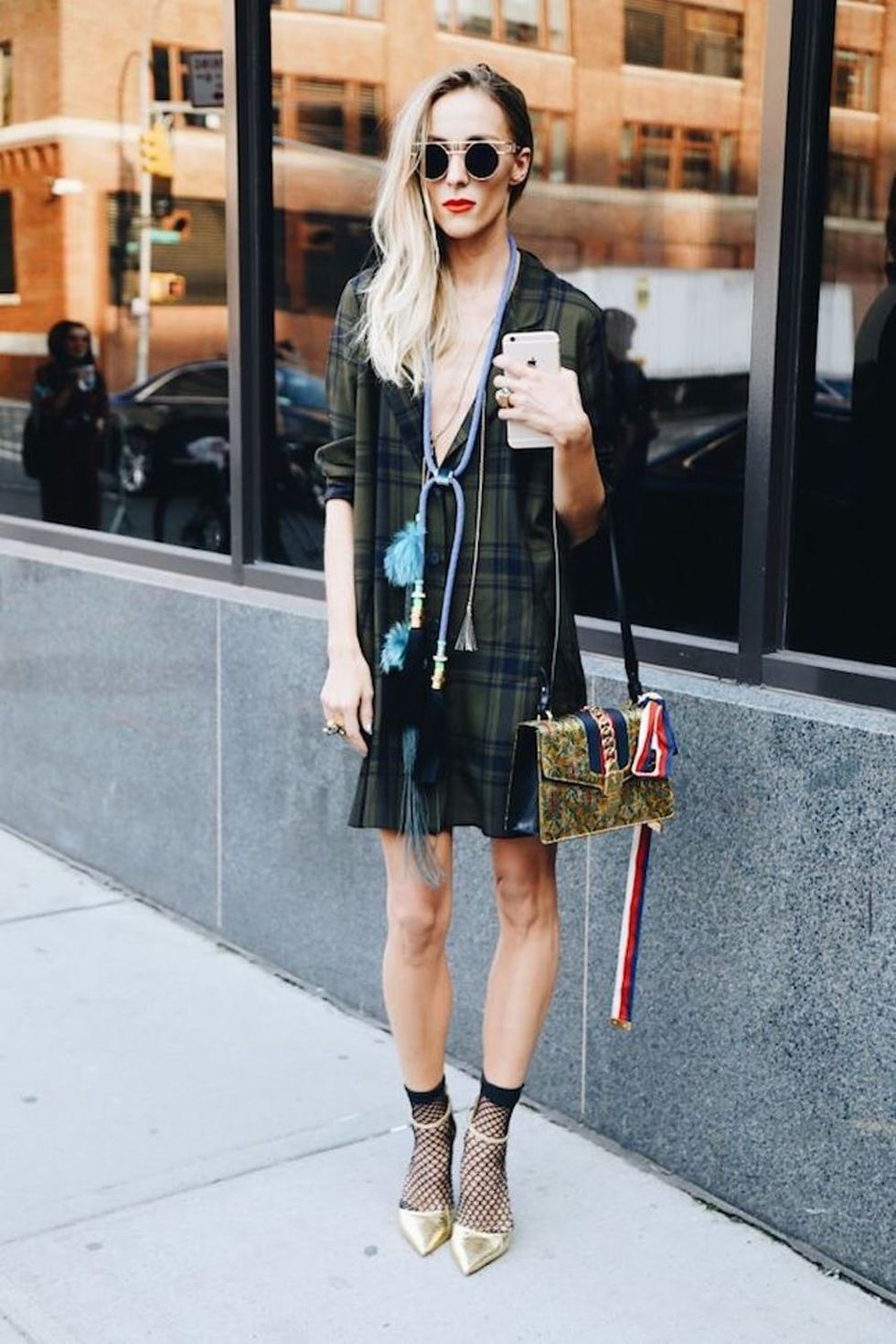 A set of fishnet ankle socks adds a fun, vampy feeling to an outfit. Pairing them with a less sultry piece like a plaid shirtdress plays down the showgirl vibe, making for the perfect balance. (Photo via Marie Simonova/Getty)