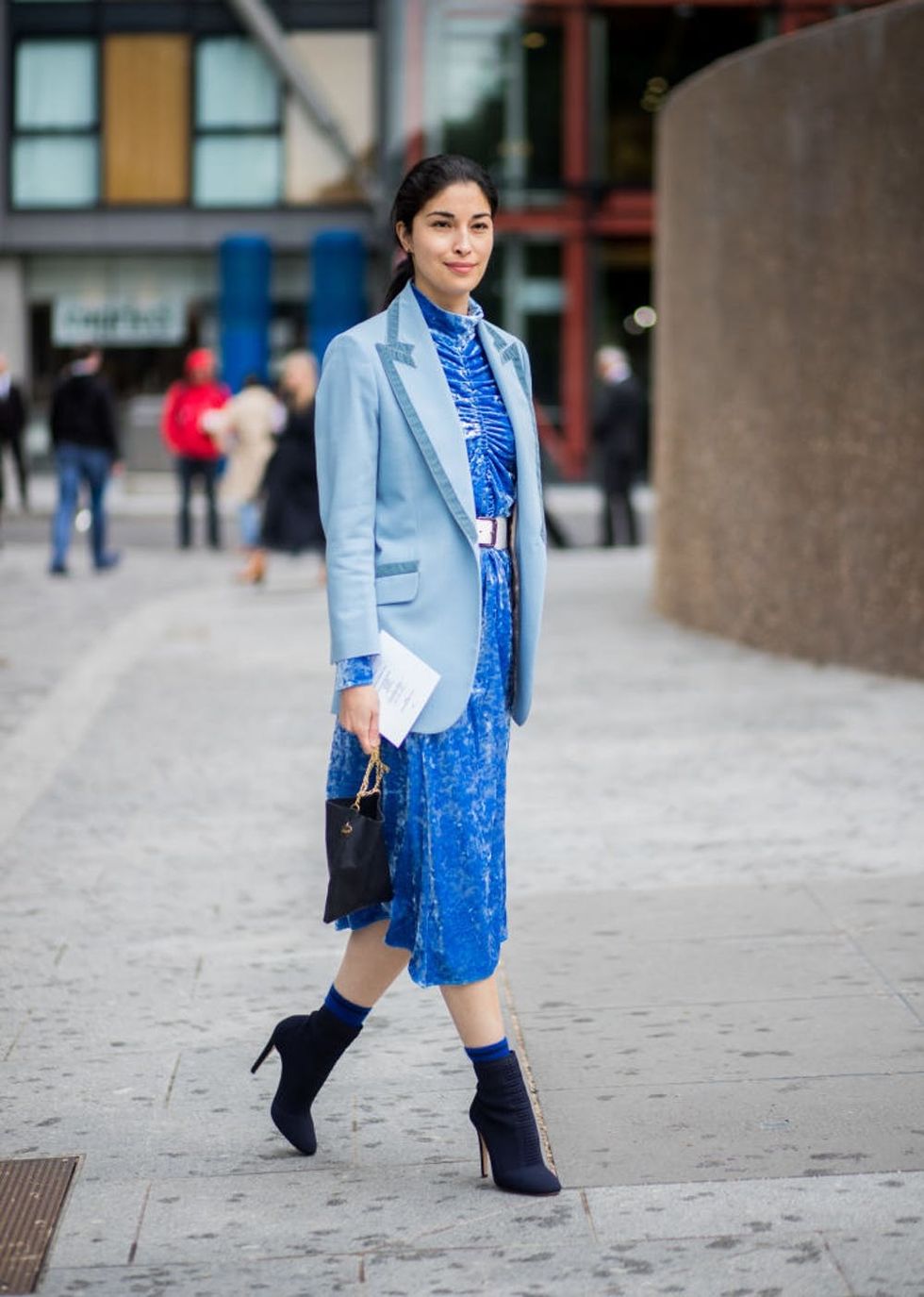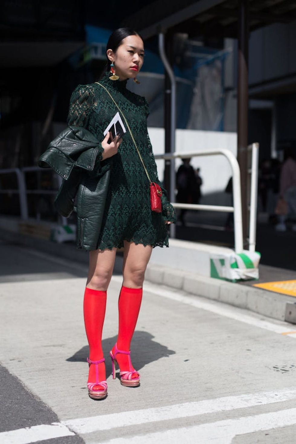 The socks with heels thing should look quirky and eclectic, but not totally random. Add a pop of color with your bag, then try coordinating your first layer of footwear in the same hue to pull the whole thing together. (Photo via Timur Emek/Getty)