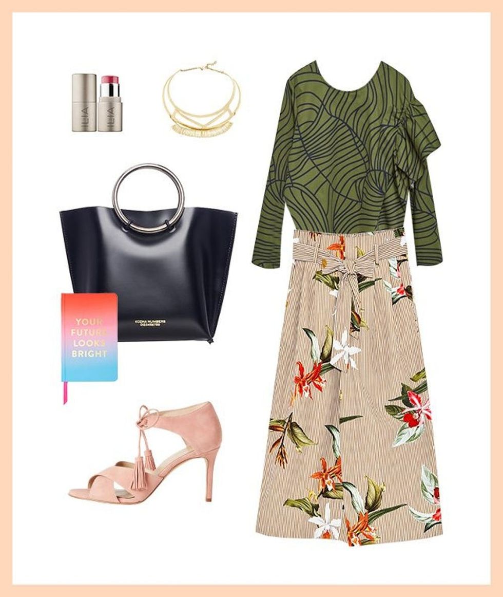 Ann Taylor Ezra Suede Tassel Sandals ($148) + Zara Floral and Striped Poplin Culottes ($70), COS Top With Gathered Shoulder Detail ($99), Marabelle Lead-Free Statement Necklace ($40), Kozha Numbers Mini Safe ($295), Ban.do Whatcha Thinkin Bout? Journal ($14), Ilia Multi-Stick ($34)