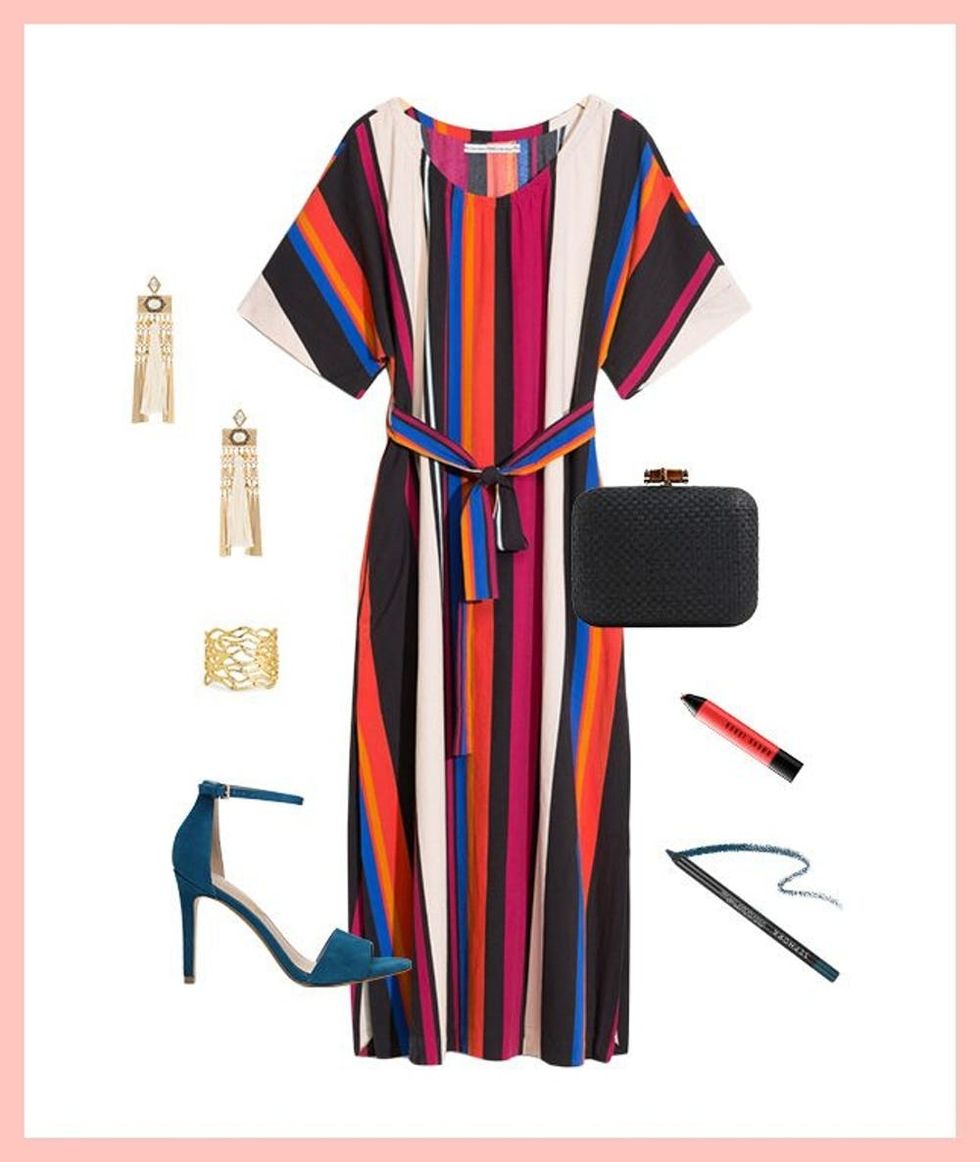 When things start to heat up, take a step back from your standard LBD routine and get ready to embrace carefree silhouettes and vibrant colors. This lightweight maxi is packed with polish and panache but will keep you cool while you schmooze and sway to the beat. Dress up its free-wheelin’ feel with statement tassel drops, colorful kicks, and a punchy makeup for a FROW ready look.