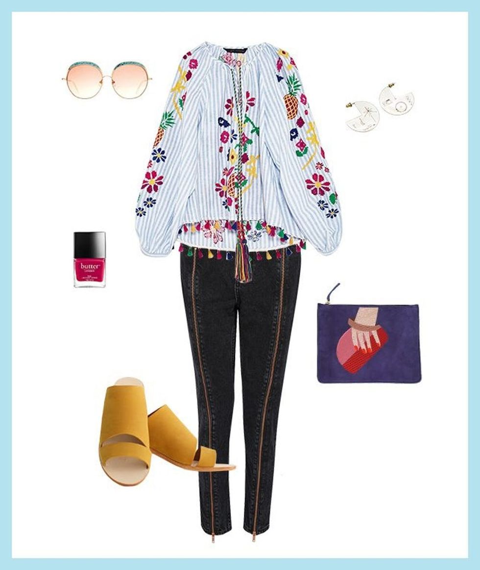 Tassels and bold embroidery come together on a bright bohemian blouse that is ready for all the laid-back events on your social calendar. Be it a backyard bash or Taco Tuesday, the scene-stealing topper will keep the good vibes alive from dawn until dusk when paired with cheery yellow mules, ’70s-inspired shades, and punchy embroidered clutch.