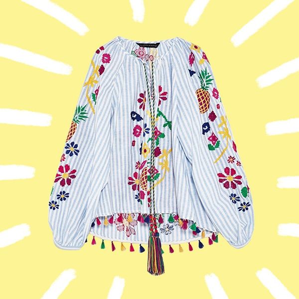 Tassels and bold embroidery come together on a bright bohemian blouse that is ready for all the laid-back events on your social calendar. Be it a backyard bash or Taco Tuesday, the scene-stealing topper will keep the good vibes alive from dawn until dusk when paired with cheery yellow mules, ’70s-inspired shades, and punchy embroidered clutch.