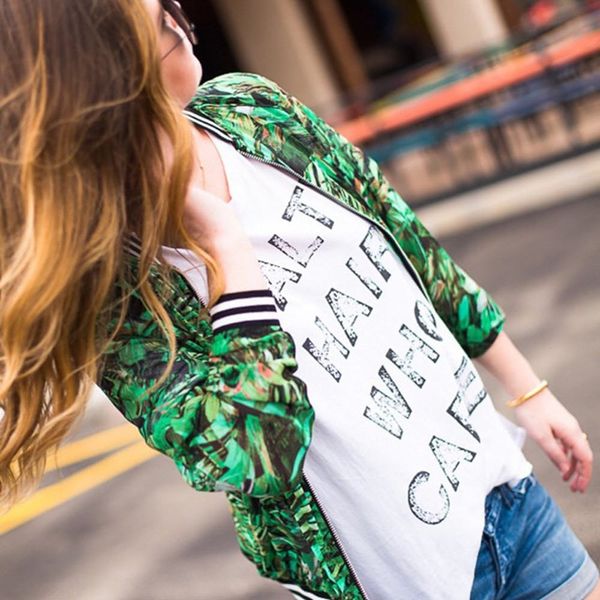 6. @sidesmilestyle: Denim still reigns supreme when it comes to warm-weather layering, but this unexpected combo of a sports luxe staple and funky tropical pattern deserves a second glance. While it pairs perfectly with a slouchy tee and classic denim, we’re willing to bet it looks equally as fly with a button-front skirt, minimalist maxi dress or even on-trend overalls.