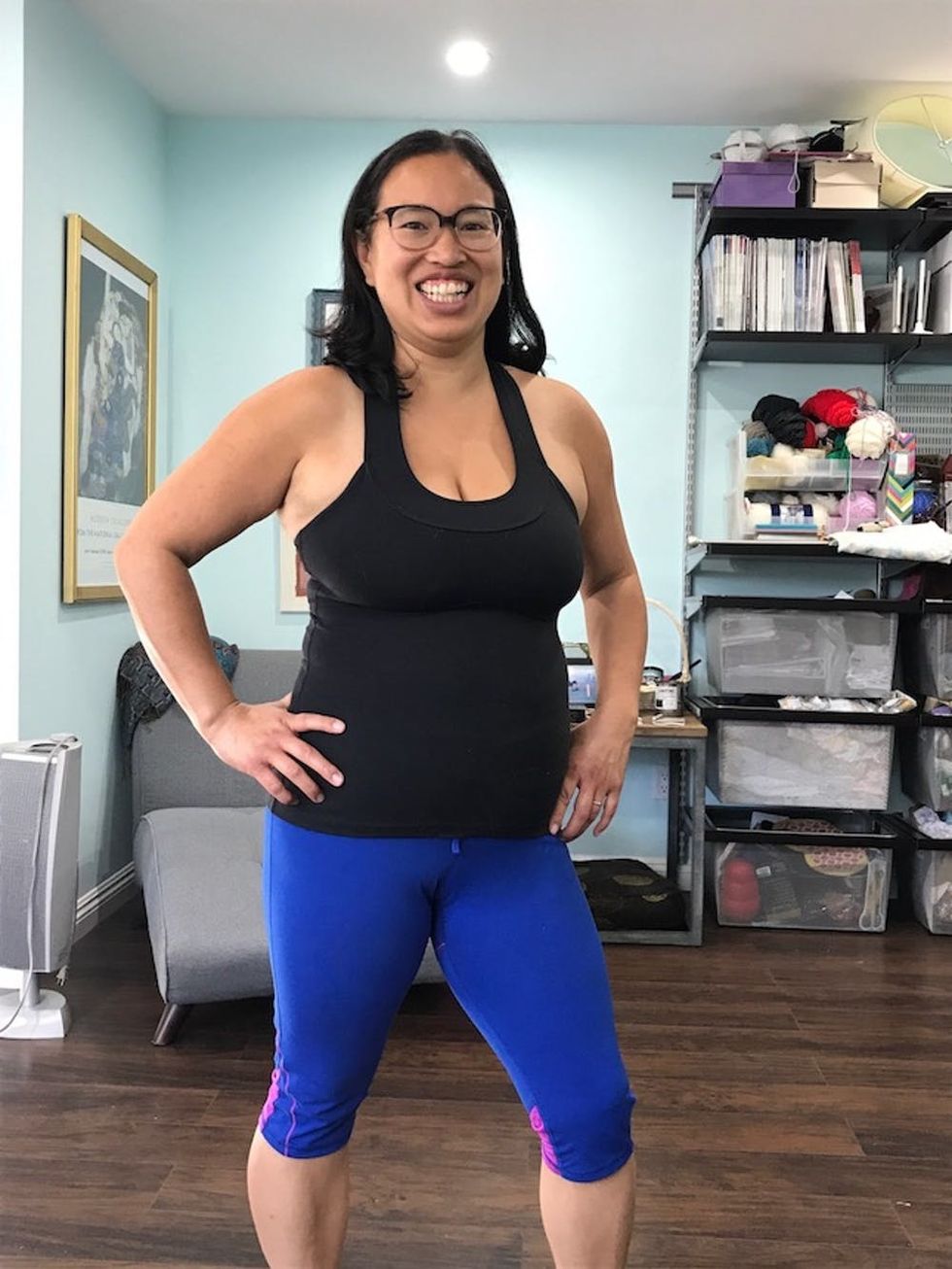 Three months later, the results are in. I’ve lost 17 pounds so far. Around my abdominal section at my belly button, I’ve lost six inches. No one has asked me when I’m due. I can fit better into pants since my belly doesn’t bulge out as much. Most importantly, I feel more energetic with my daughters. Working out again has made me feel less stressed out. I love planning for cheat meals so I can eat those things I miss — like tacos, vegan burgers, and chocolate cake — without feeling like I’m depriving myself of my favorite foods. I’m continuing to stay in Phase 2 and sticking with three minutes of abdominal exercises every day.