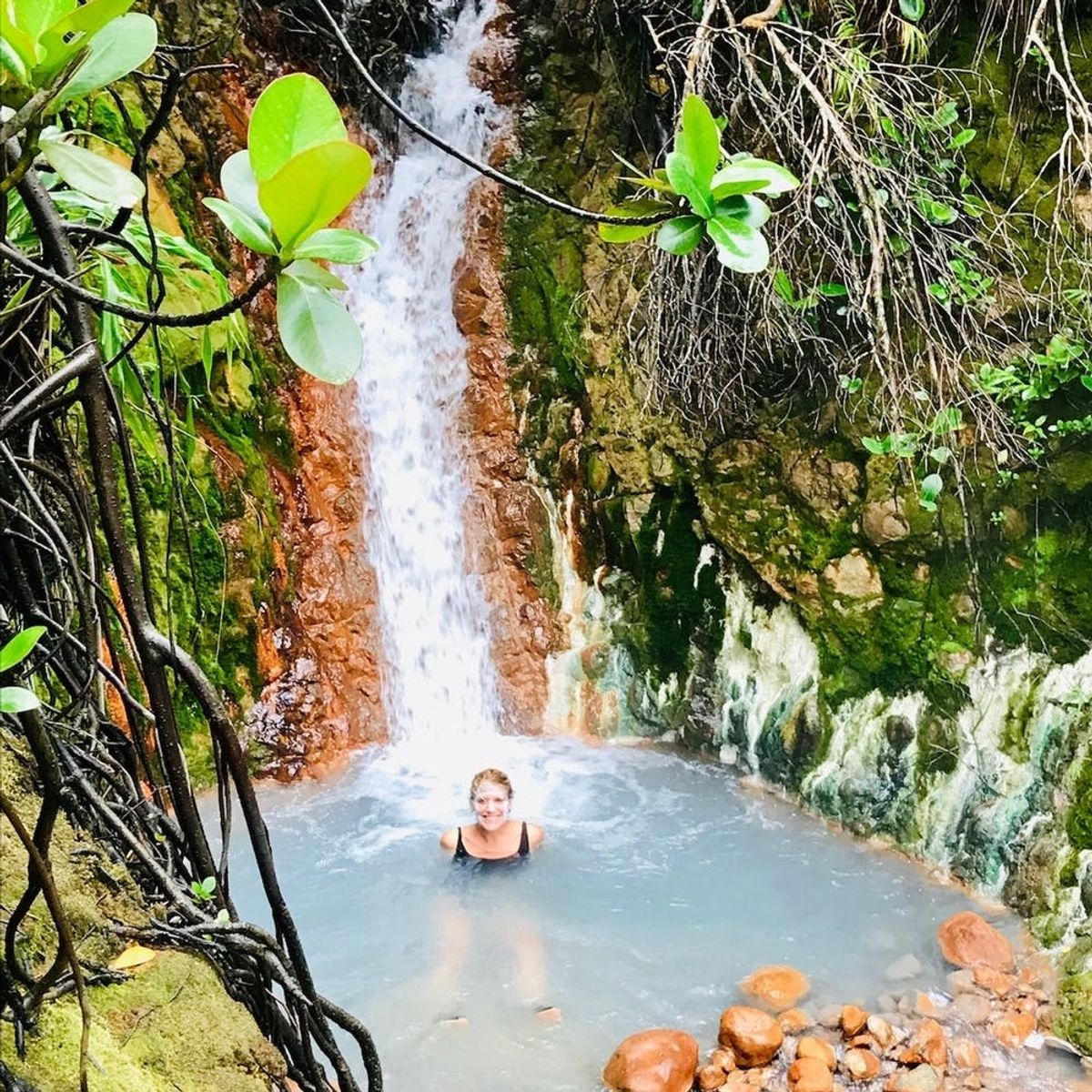 There was so much sulfur on the rocks that you could write your name on them. It started to drizzle, though the rain would come and go. Marvin led us to go swimming beneath a waterfall in one of the natural hot springs, where we rinsed the mud masks off our faces.