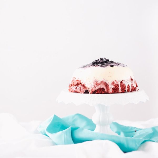 What is a bombe, you ask? Well, a bombe (technically bombe glacée) literally translated means cold bombshell. And boy is it a cold, delicious bombshell of a dessert. Packed with layers of ice cream and cake, there is no denying the appeal of a spherical ice cream cake. And so, to celebrate Memorial Day, we’re giving this delectable frozen treat a patriotic spin with red velvet cake, french vanilla ice cream and a luscious blueberry compote! The one thing about the ice cream bombe is that, though it’s easy to make, it takes time, because you have to let the layers freeze in between, so make sure to plan for that if making for a picnic or party. Let’s get started!