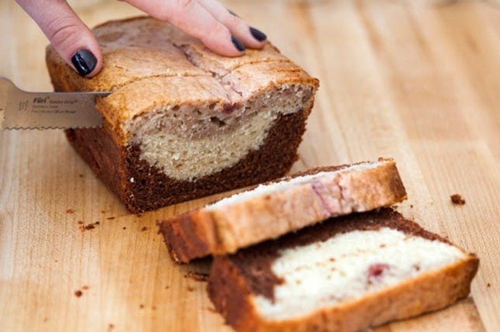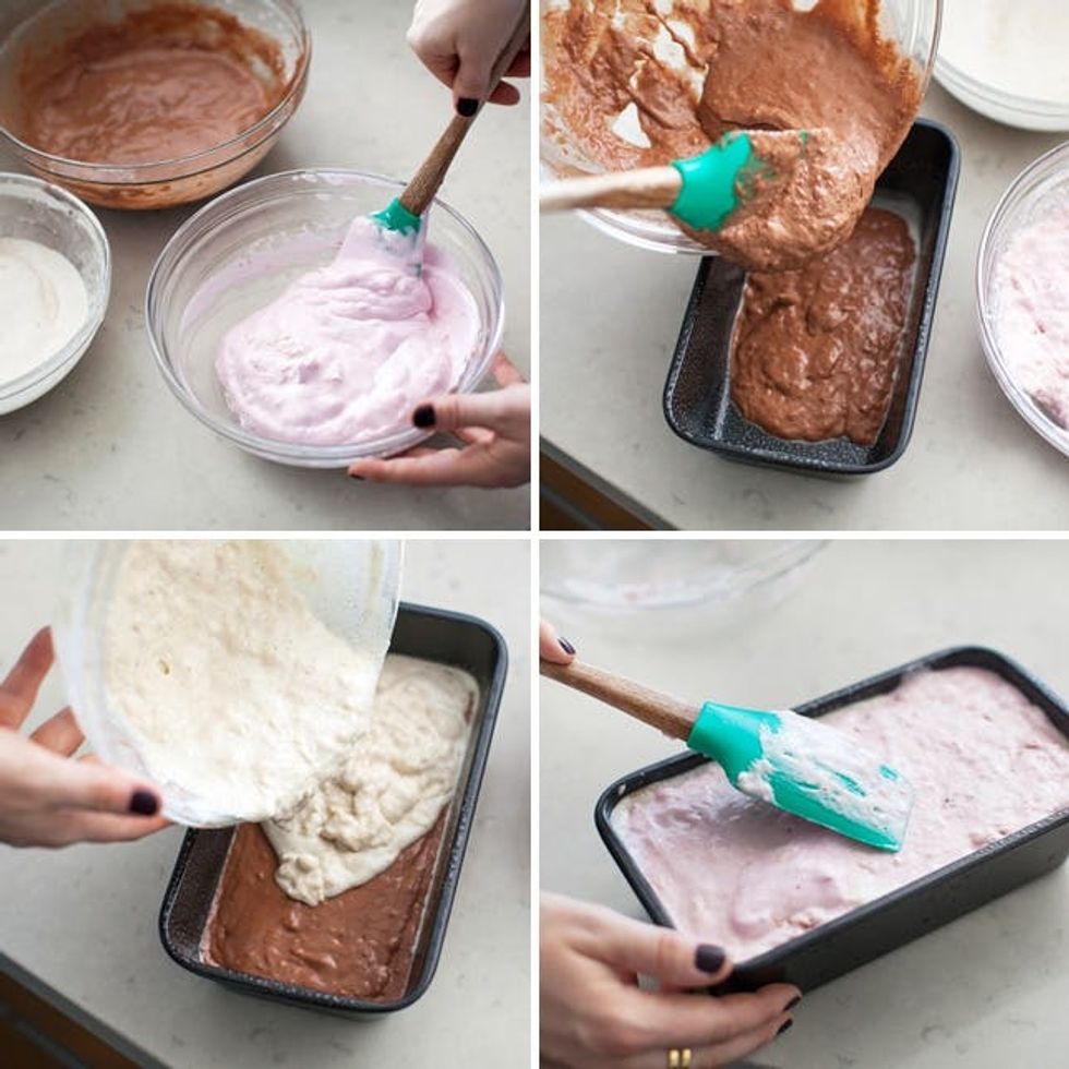 4. Pour chocolate batter into a greased 9×5 loaf pan. Next, layer the vanilla batter into the pan. Finally, pour the strawberry batter on top. Bake for 55-60 minutes. Let cool.