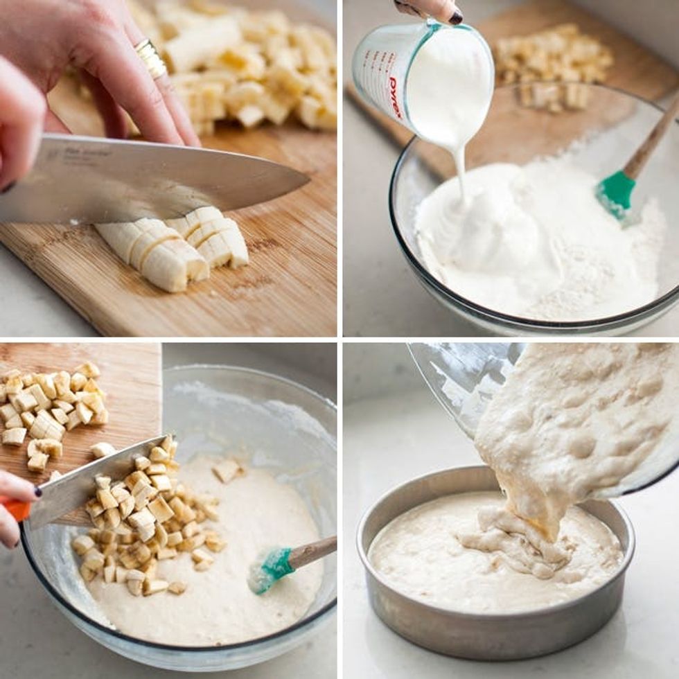 Preheat the oven to 350 degrees F. Mix the ice cream, flour and sugar until just combined. Chop your bananas and fold them into the batter. Pour into a 9×2 round cake pan and bake for 55-60 minutes.