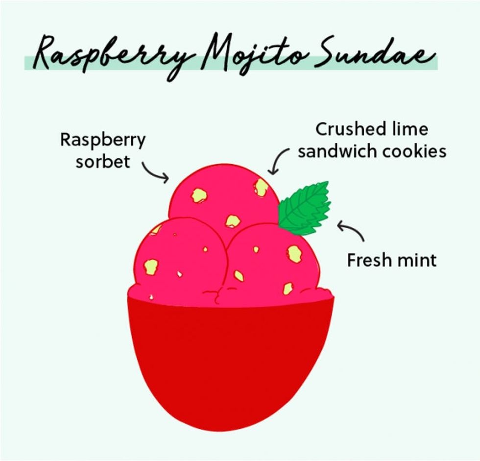 2. Raspberry Mojito Sundaes: Raspberry sorbet topped with crushed lime cookies and fresh mint is your fave cocktail in dessert form.