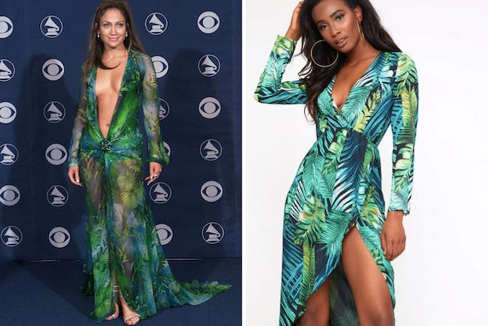 1. Jennifer Lopez: No moment is arguably more iconic in red carpet history than the one that launched Google image search — literally. Though this Pretty Little Thing Ursie Tropical-Printed Maxi Dress ($62) is *slightly* less racy than J.Lo’s original Versace stunner, the print is a near-match. And, should you really want to go bold and do it up, there’s always scissors to make that V just a litttttle bit deeper! (Photo via Scott Gries/Getty)