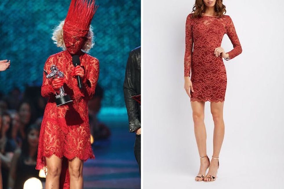 4. Lady Gaga: Her *most* iconic fashion moment may have come in the form of her 2010 VMAs meat dress, but since we don’t particularly recommend wearing raw meat out on the town, we’ll settle for the next best thing — the red lace Alexander McQueen mini dress Lady Gaga wore the year before for the 2009 MTV Music Video Awards. This Charlotte Russe Floral Lace Bodycon ($25) takes care of the frock, and a quick trip to Michael’s for a little extra red lace fabric will make for the perfect covering for a tall black crown tiara ($6). (Photo via Christopher Polk)