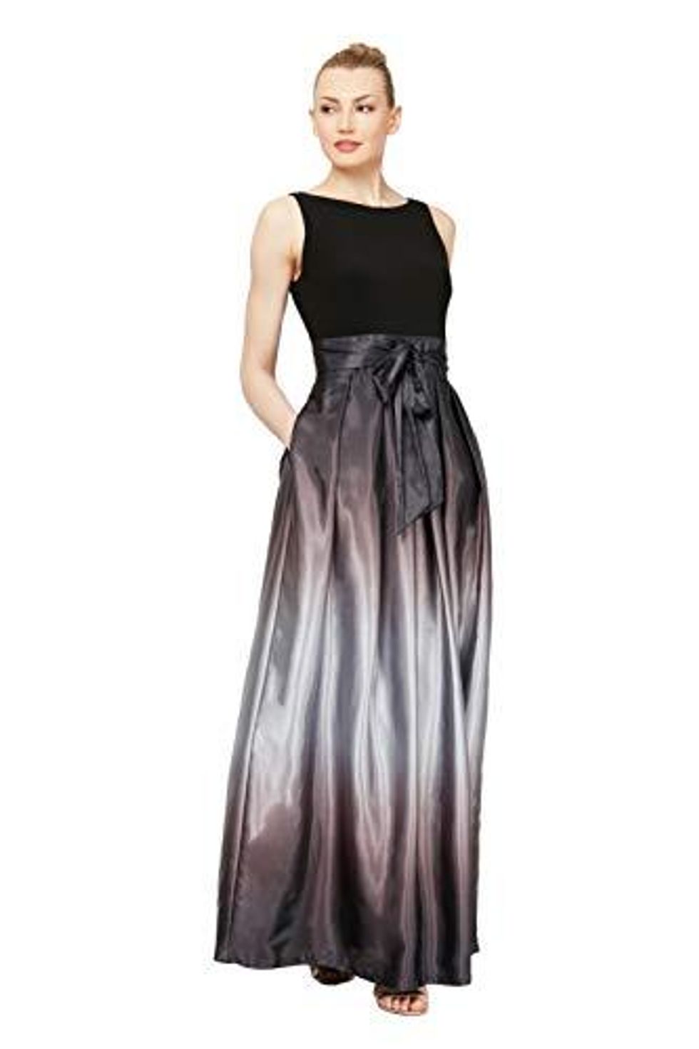 The ombre skirt of this S.L. Fashions Dress is absolutely beautiful, and you have your pick from the ten color options available. Plus, depending on which color you choose, you may get a long or short sleeve. The low back is also quite flattering, and the satin bow is an amazing detail.