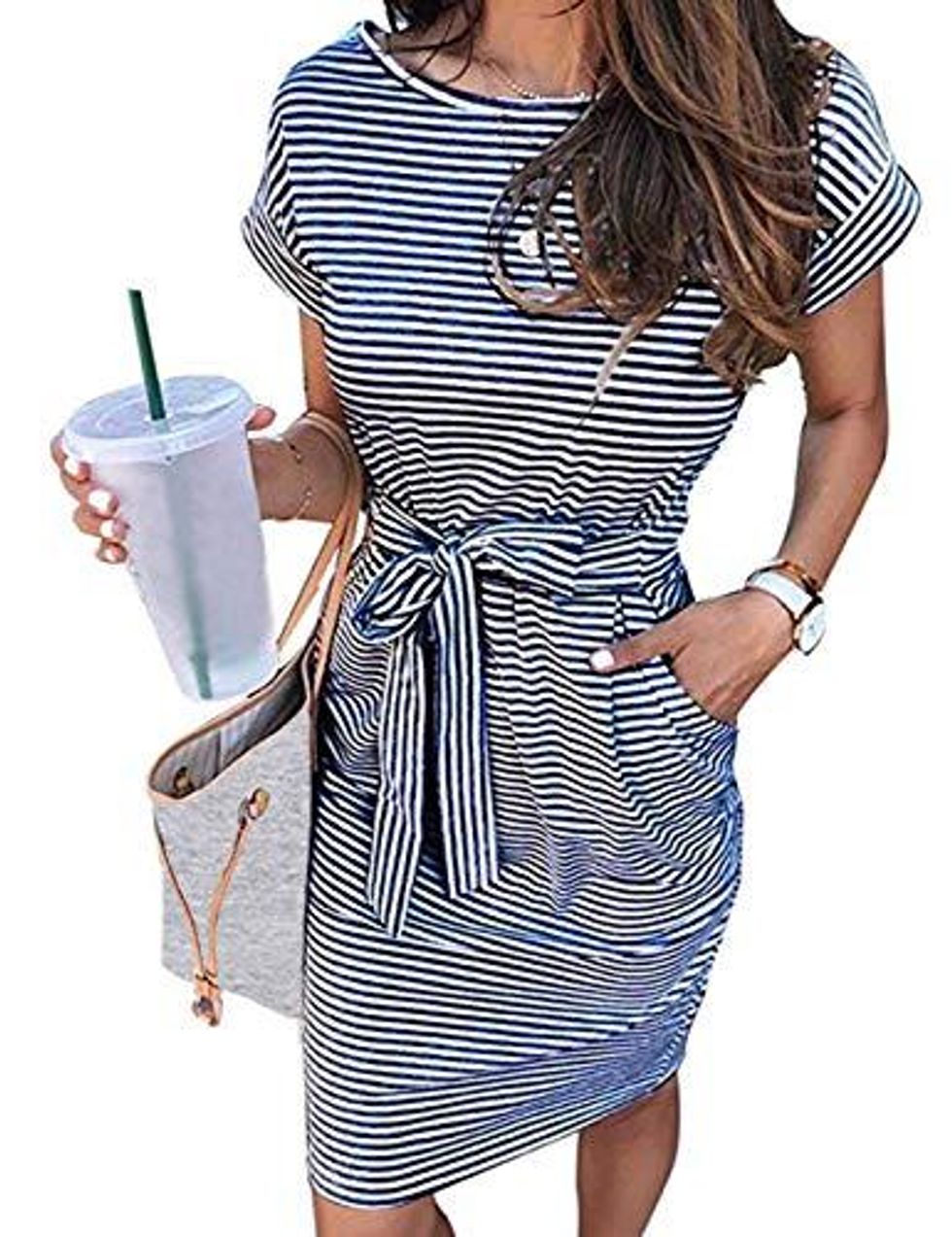 I’m a sucker for anything pinstriped, so this VFSHOW Dress is my personal favorite. It looks super professional yet chic, and it has a front zip that can be adjusted to your preference. One reviewer wrote this: “The pockets hold phone, wallet, keys, etc without looking off. They are awesome. The cut is the a line fit and flare style that flatters most body shapes. It comes just at my knee so it's going to be fine in even a conservative office. I feel great in this dress. It looks good with the front zipper up or partially down.”