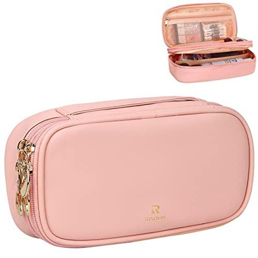 This convenient travel makeup bag has two layers of storage for beauty products and accessories. The surface material is made of a durable, scratch-resistant, and waterproof material that is similar to leather to the touch.