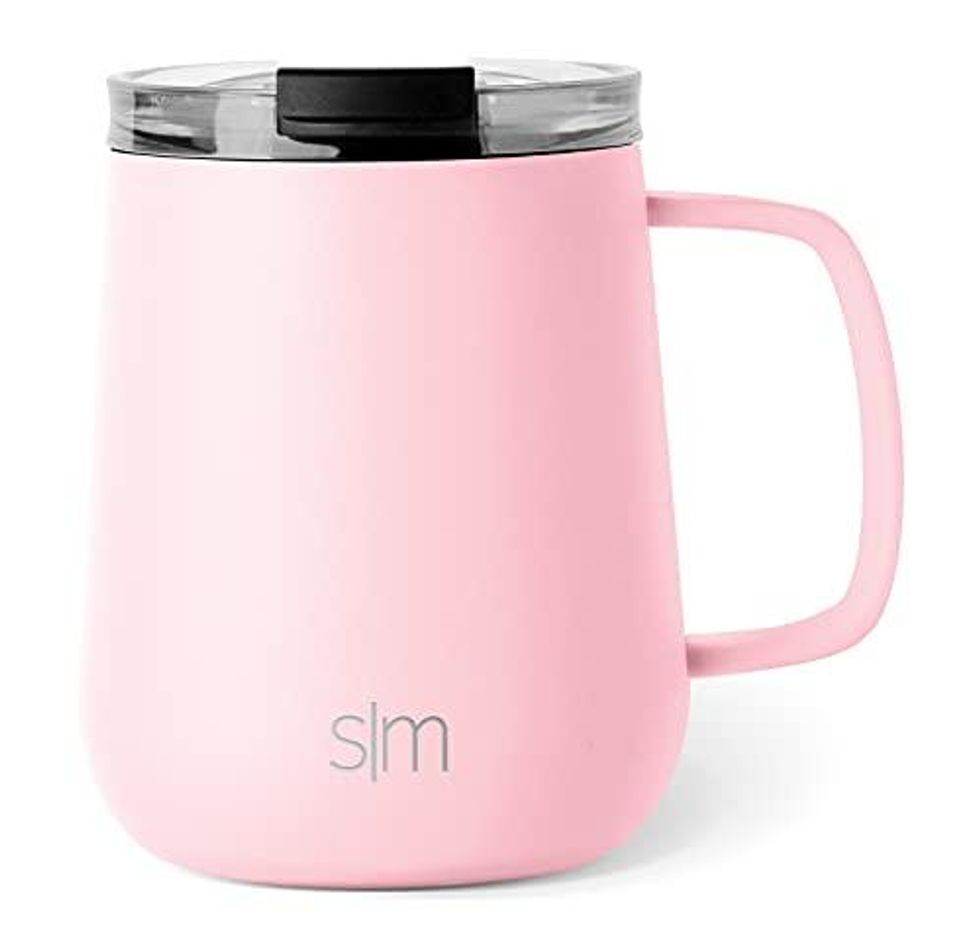 This pink travel mug is stainless steel and holds up to 12 ounces of your favorite hot drink. Dishwasher safe, this insulated mug includes a sturdy lid and handle for easy on-the-go sipping.
