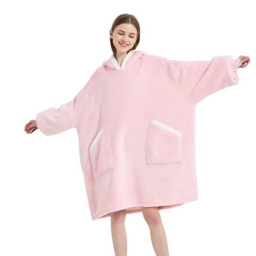 Give the gift of cozy comfort with this pink oversized wearable blanket sweatshirt that comes with two big pockets for your phone, kindle, or TV remote. It can even be worn outdoors during chilly sporting events.