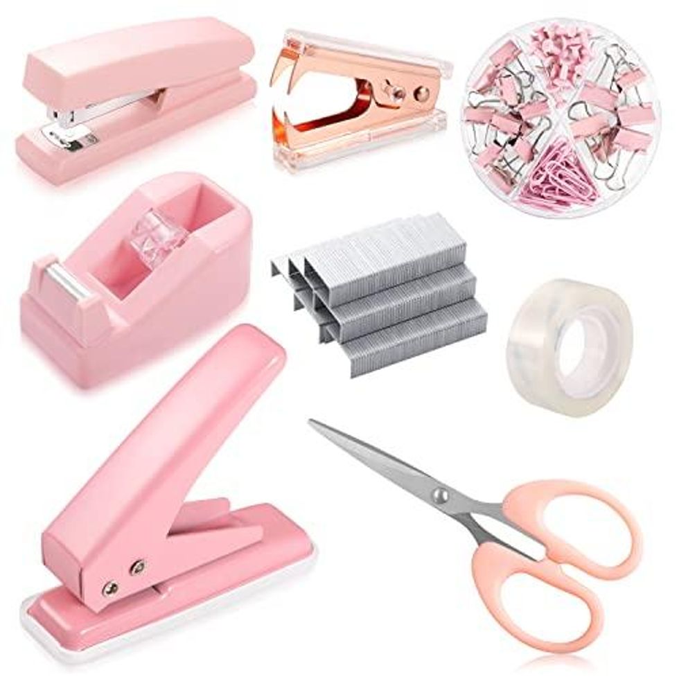 This office set has all of the pink things the corporate girly needs. Everything from tape to paper clips, to pins, and even scissors...it's all perfectly pink!