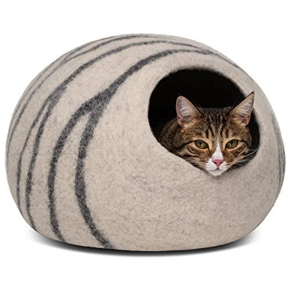 This premium felt cat bed cave is handmade from 100% Merino wool. It comes in different shades and is designed to keep the kitty warm in winter and cool in summer. It not only gives the cat a private retreat to sleep and hide in but is ultra-durable so that cats can also relax and play on top of it. It's available in multiple sizes, depending on the breed of cat and even better, it's 100% free from harsh chemicals and synthetic materials so you know that you're giving the cat the absolute best environment for its naps.