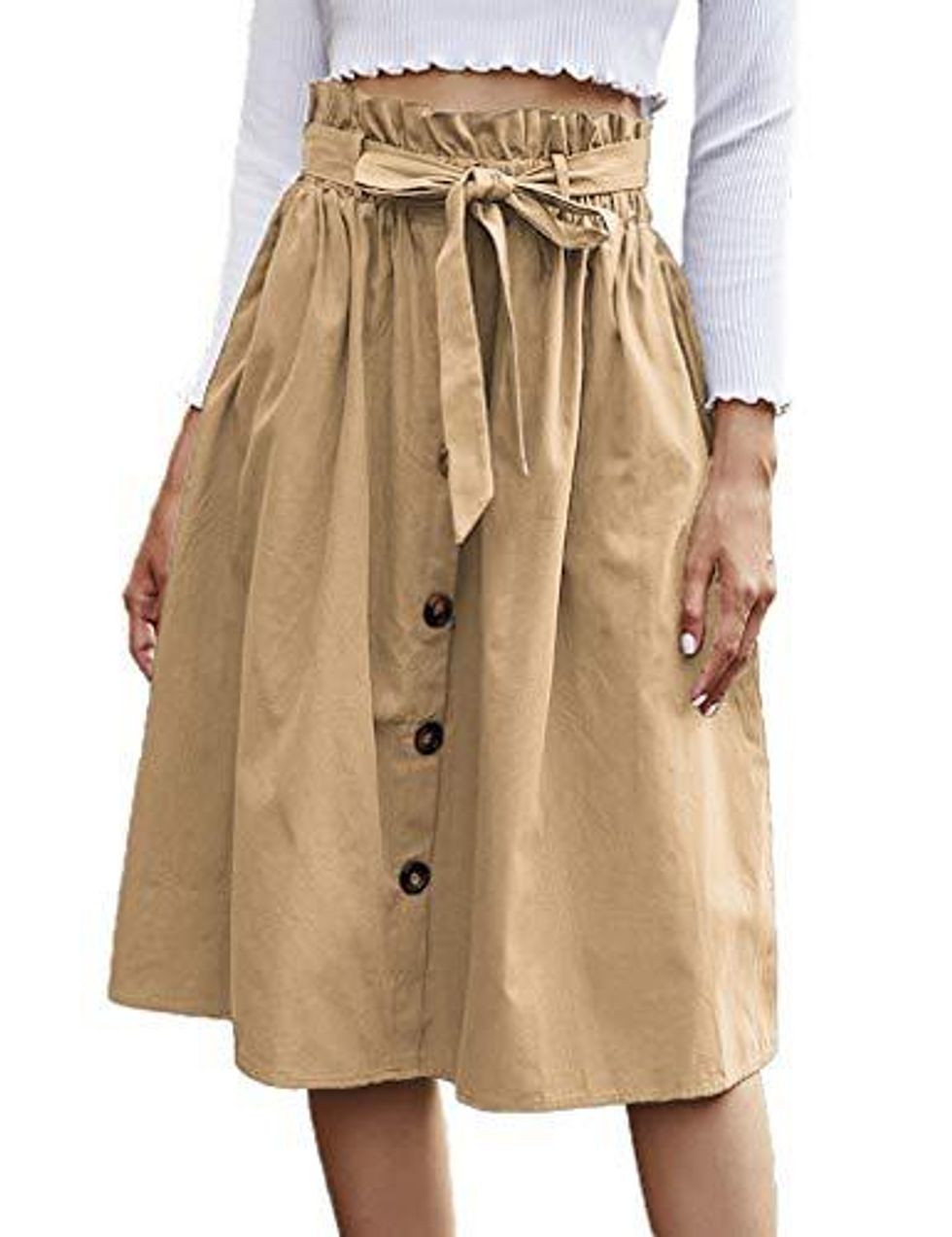 If you want a super cute summer skirt that you can wear in the fall, you’ll love the Nagoo Midi Skirt, which not only has a color scheme that makes it perfect for both, but it also has the perfect length for both seasons. The paper skirt design is super cute, and it is accentuated by the tie front design, as well as the decorative buttons. Minimalist but super chic!