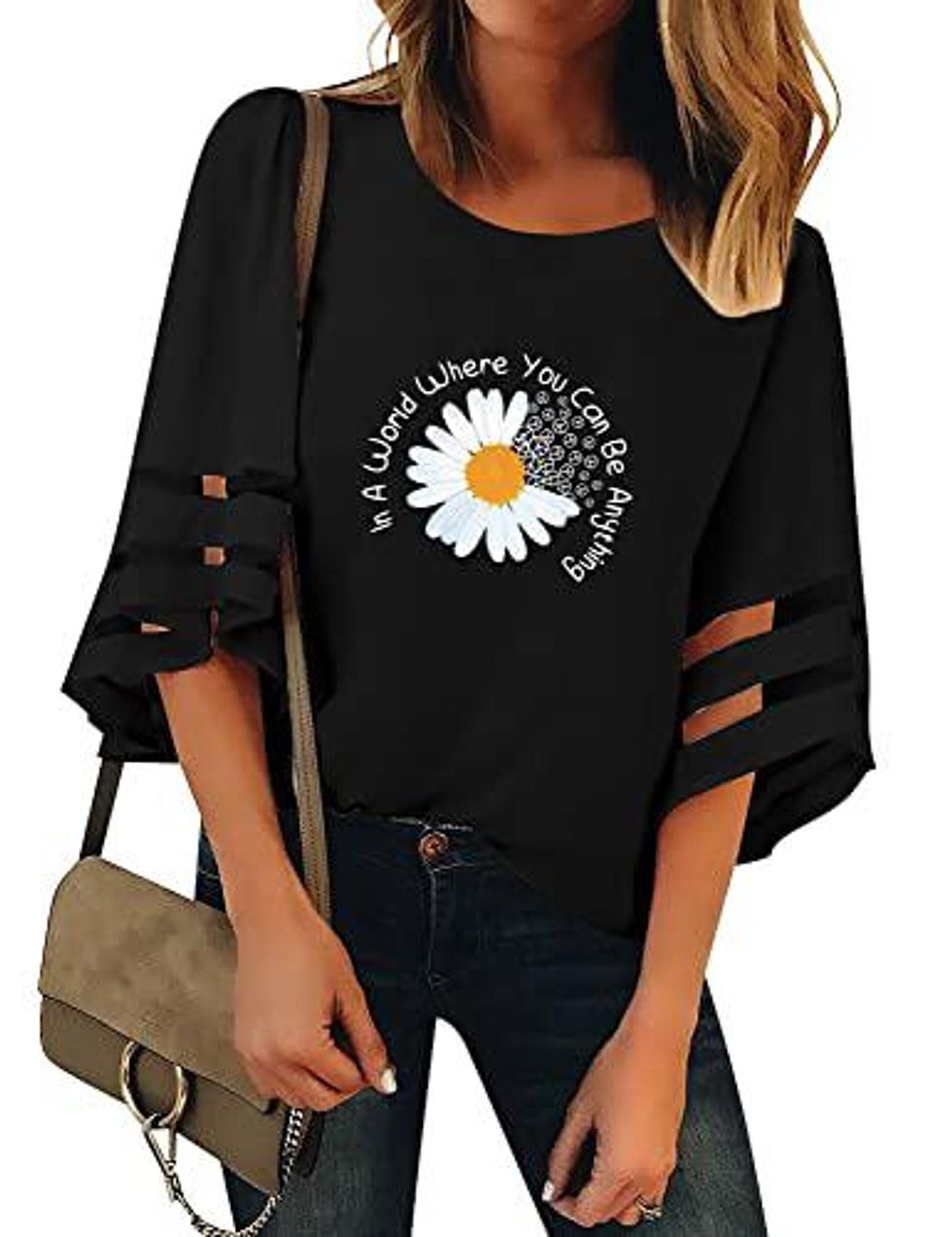 The LookbookStore Top has stylish loose bell sleeves that are super classy, as well as stylish due to the mesh panels. Plus, this one has a cute little print on it, which is both uplifting and goes with the summer vibes. Also, you’ll be happy to know it is very lightweight and soft.