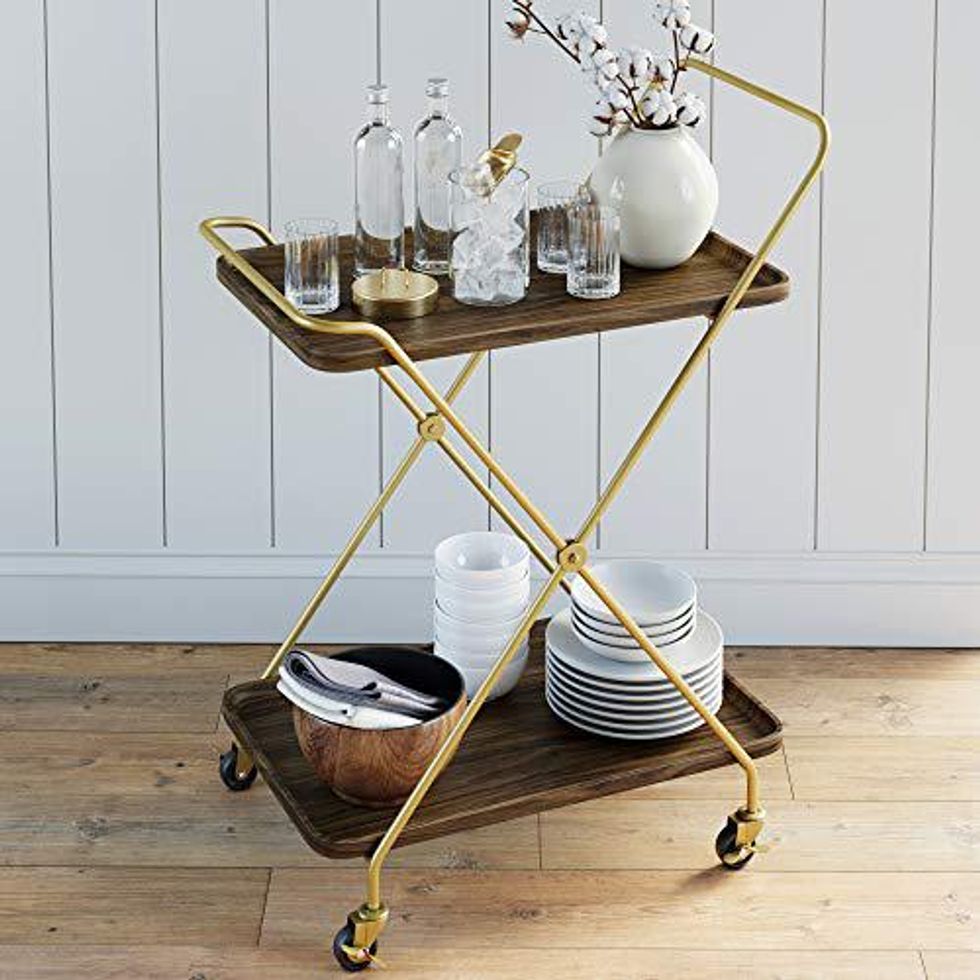 I like that this rolling bar cart can be moved around to be both an indoor and outdoor bar cart. It has a simple and chic design that won't detract from the room it's in. It's the perfect thing to have around when you're having people over.